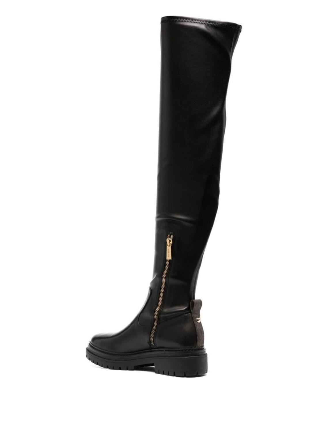 Черный, телячья кожа, строчка в тон, золотистая фурнитура, короткая застежка на молнии сбоку, миндалевидный носок, петля для подтягивания сзади, длина по колено, низкий каблук и резиновая подошва.
