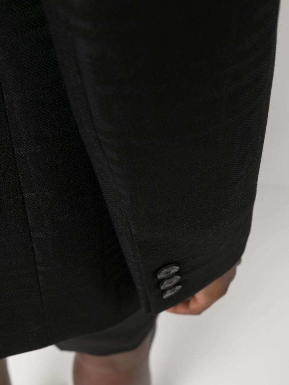 Черный, шерсть, знаковый узор 4G, жаккардовый материал с узором, зазубренные лацканы, застежка на пуговицах спереди, подплечники, длинные рукава, манжеты на пуговицах, прорезной карман на груди, два передних кармана с листочкой, шлица по центру сзади, прямой подол, внутренний прорезной карман и внутренняя бирка с логотипом.