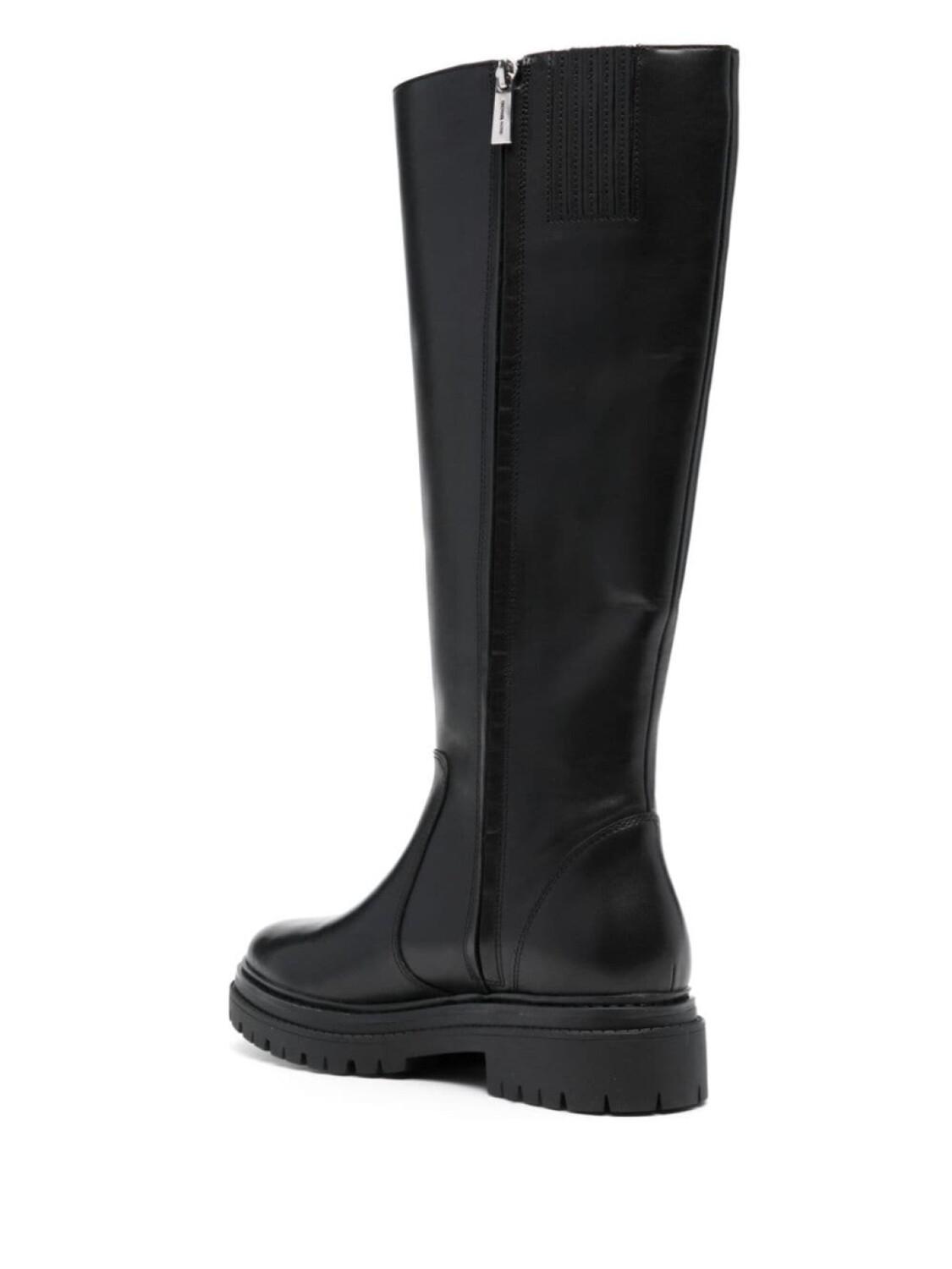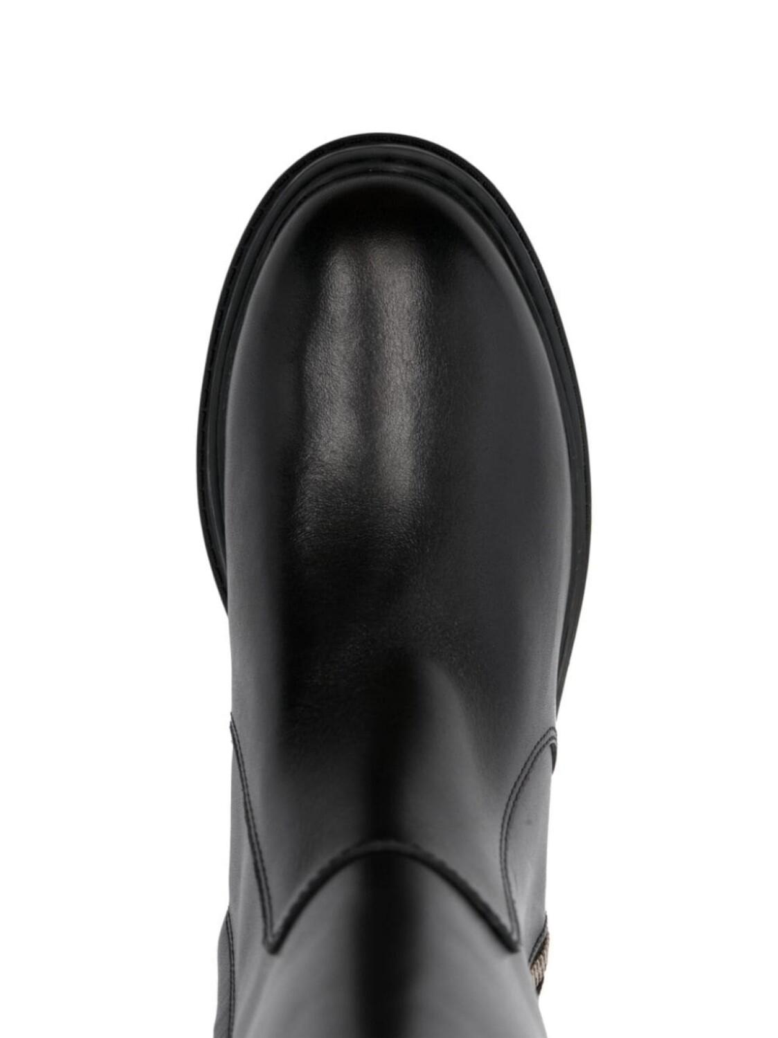 Черный, телячья кожа, застежка на молнии сбоку, закругленный носок, высота по колено и массивная резиновая подошва.