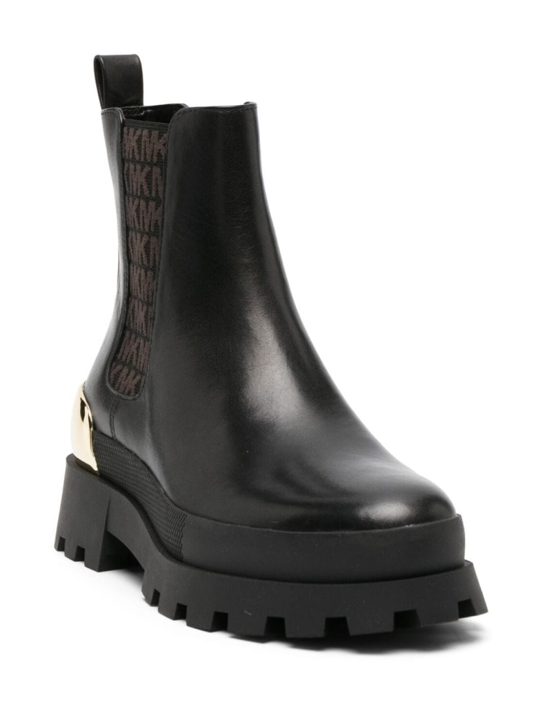 Черный, телячья кожа, эластичные боковые вставки, монограмма, золотистая фурнитура, петля для подтягивания сзади, высота по щиколотку, миндалевидный носок, контрастный задник с логотипом, стелька с логотипом и массивная резиновая подошва c протектором.