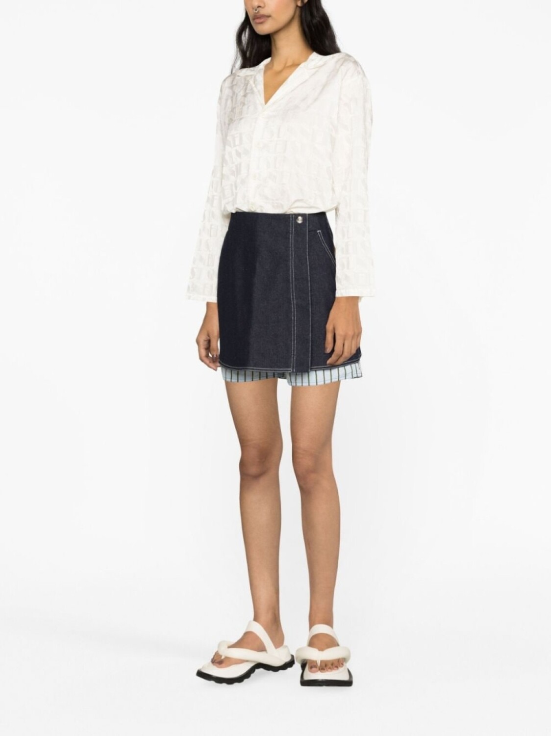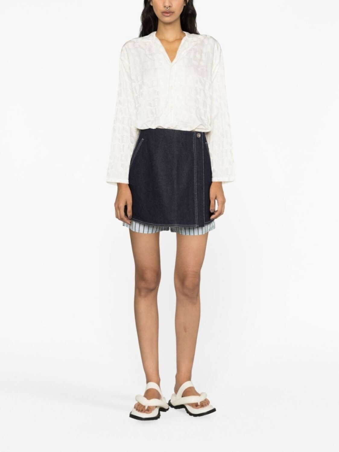 Белый, жаккардовый логотип, отложный воротник, застежка на защелке, застежка на пуговицах спереди и длинные рукава.