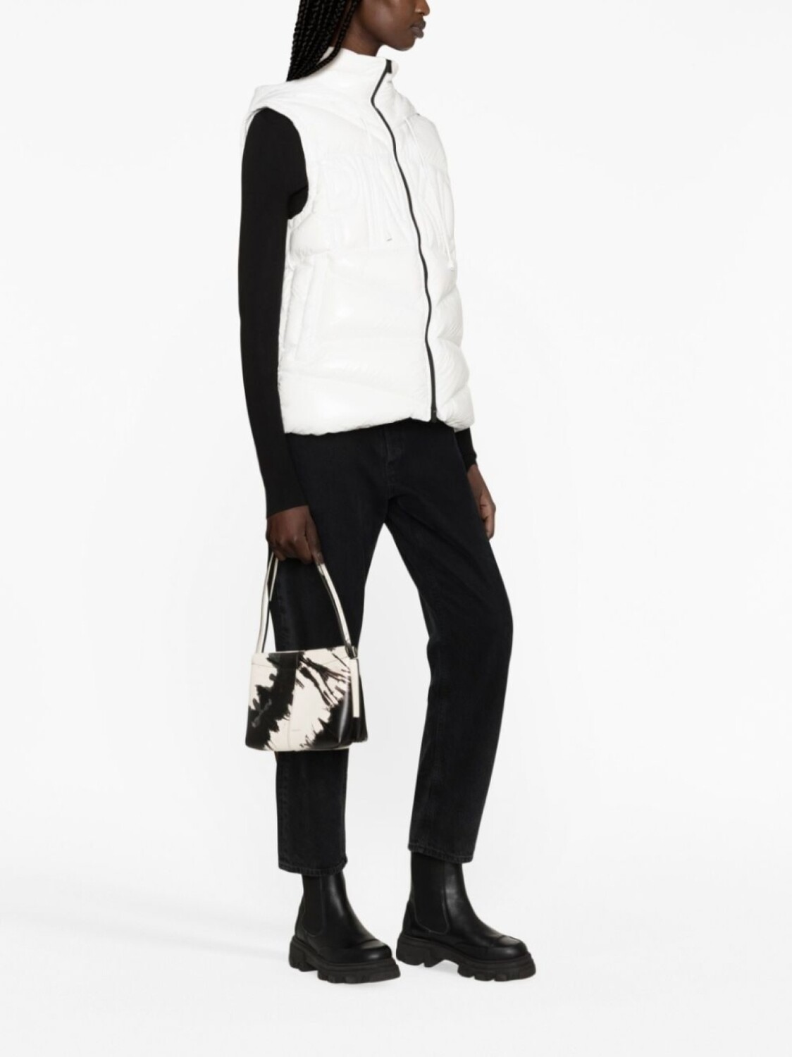 Белый, глянцевая фактура, дутый материал, тисненый логотип спереди, высокий воротник, застежка на молнии спереди, без рукавов, два прорезных кармана по бокам и прямой подол.