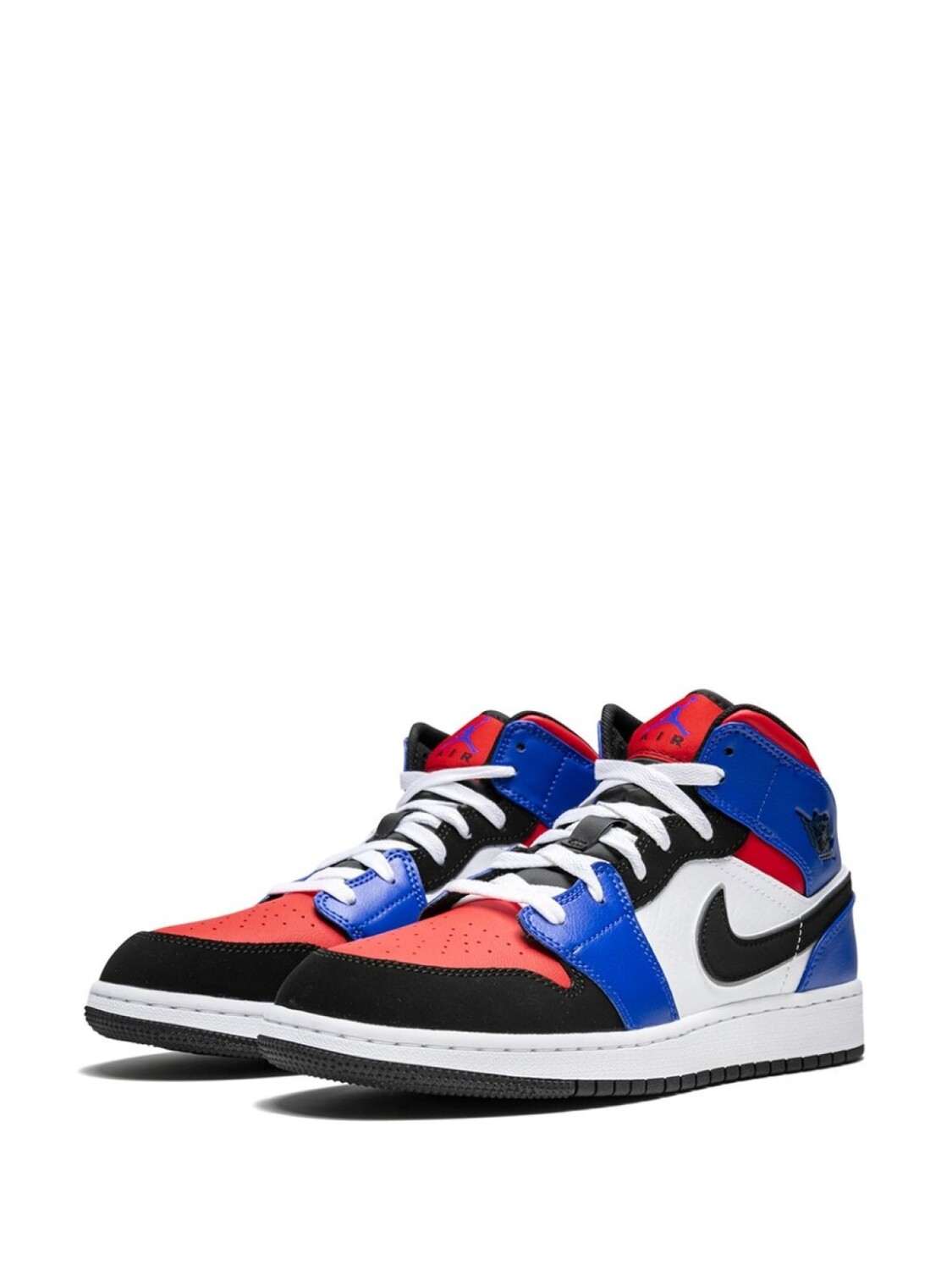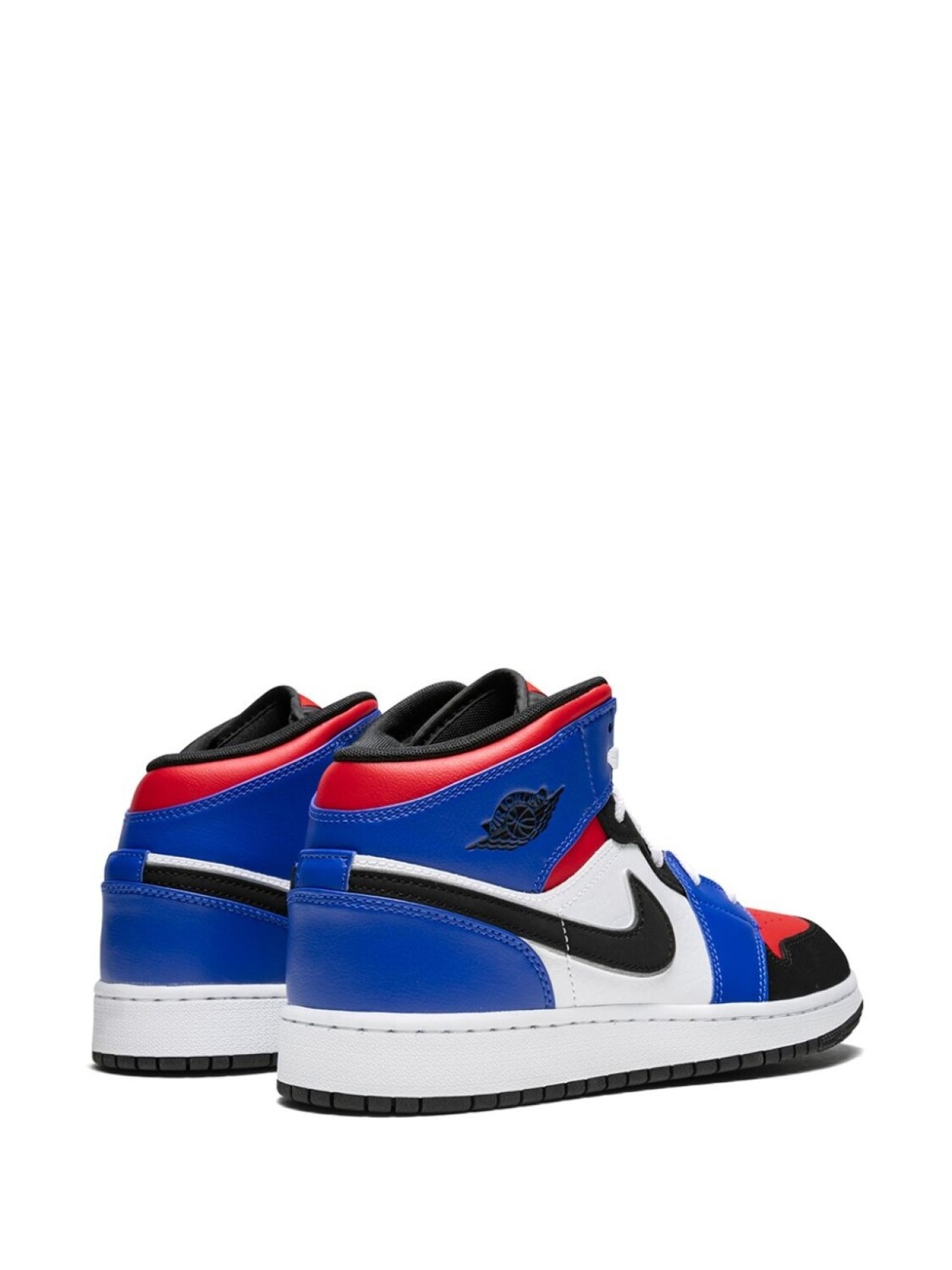 Высокие кожаные кроссовки Air Jordan 1 Mid (GS) в белом, синем и красном цвете от Jordan. Передняя шнуровка, ребристая резиновая подошва и замшевые панели.