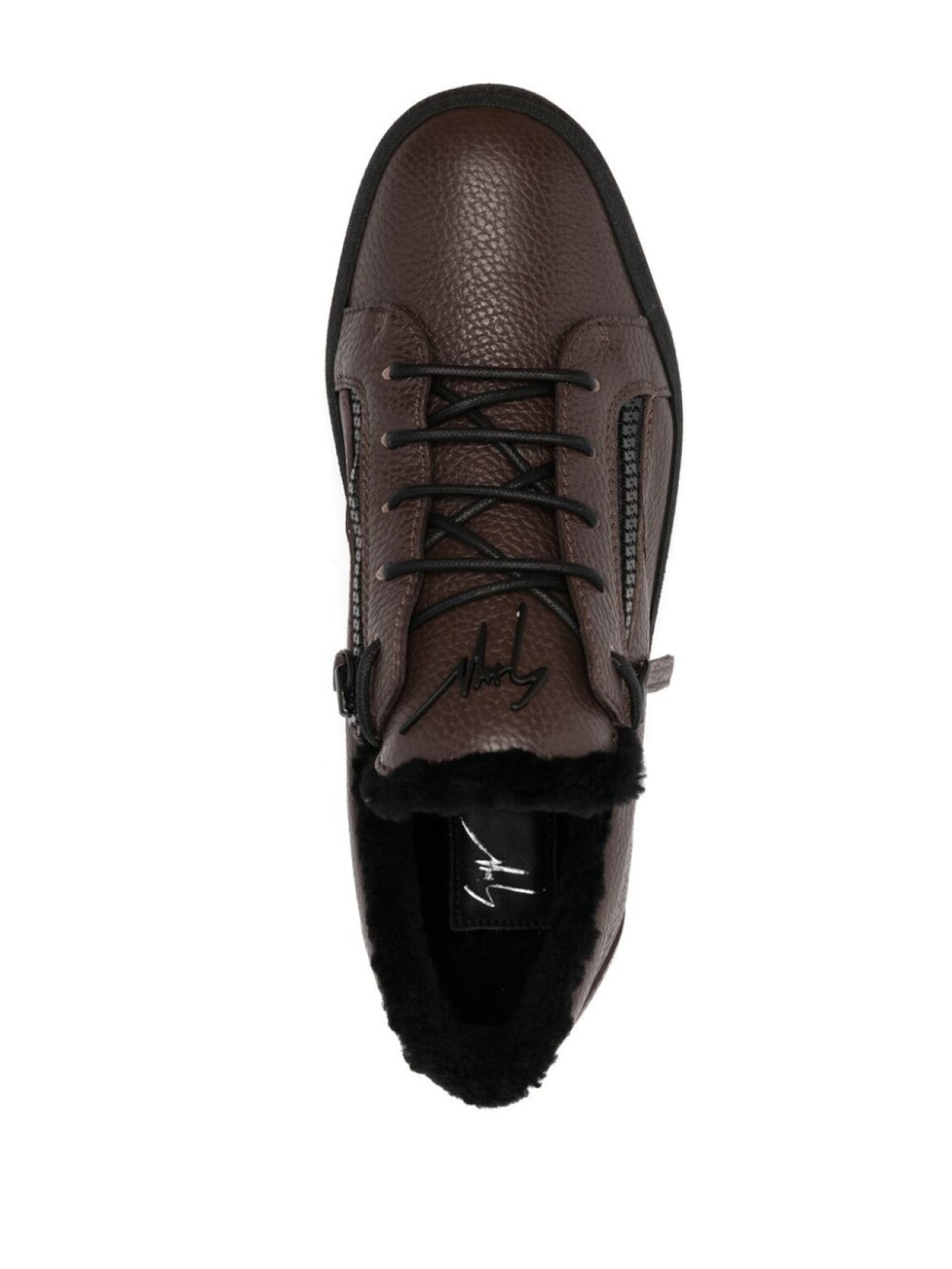 Шоколадный, телячья кожа, зернистая текстура, шнуровка спереди, отделка с декоративной молнией, стелька с логотипом, закругленный носок, нашивка с логотипом на язычке и плоская резиновая подошва.