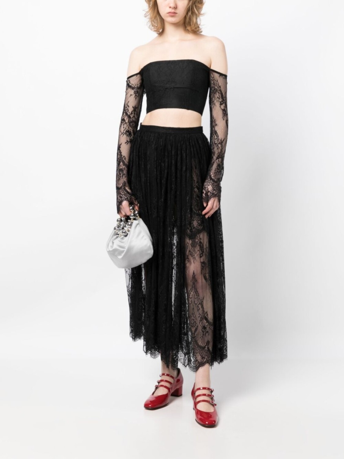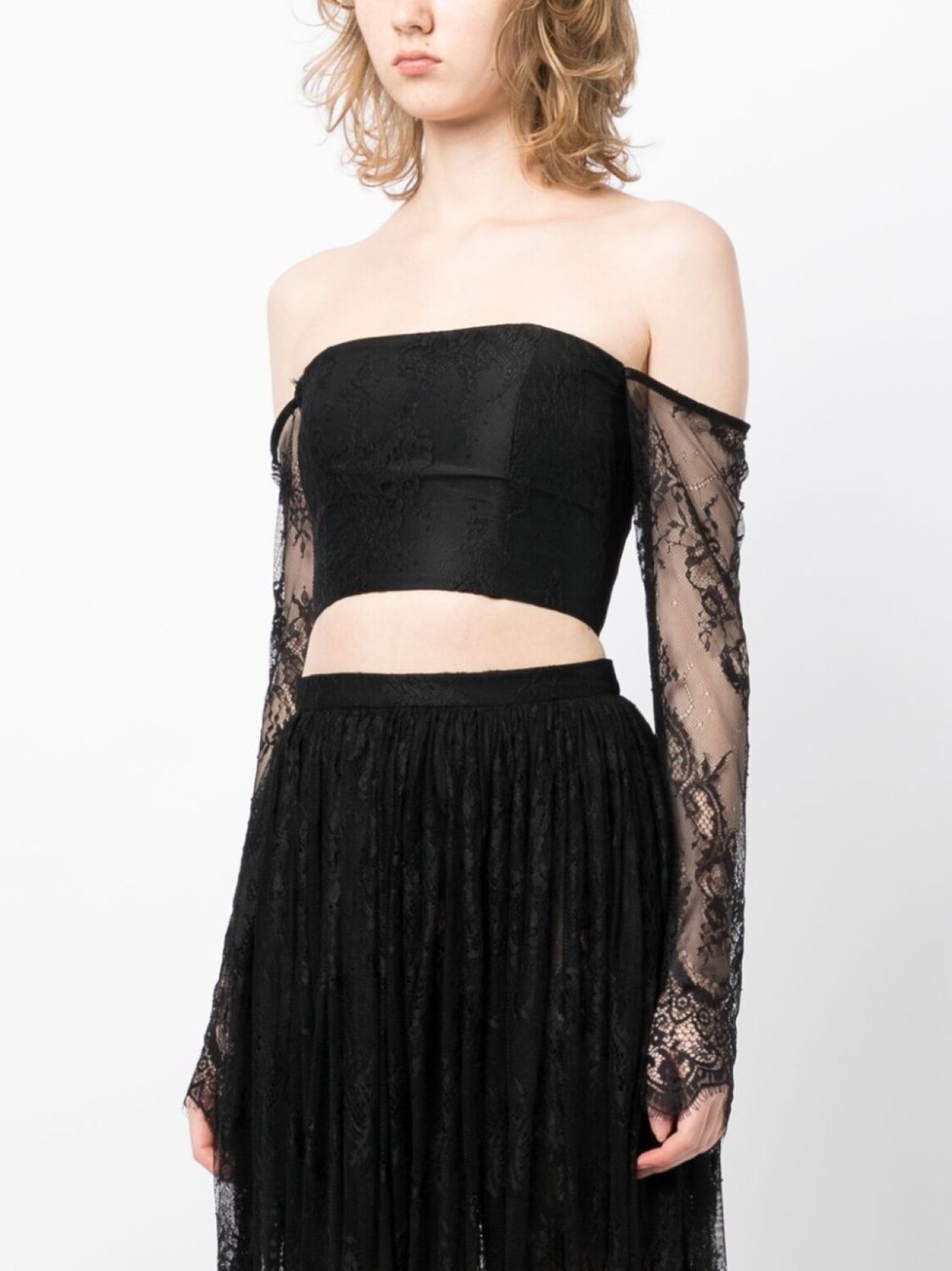Черный, гипюровое кружево, полупрозрачный верхний слой, швы, квадратный вырез, застежка на завязке сзади, открытые плечи, длинные рукава и укороченная длина.