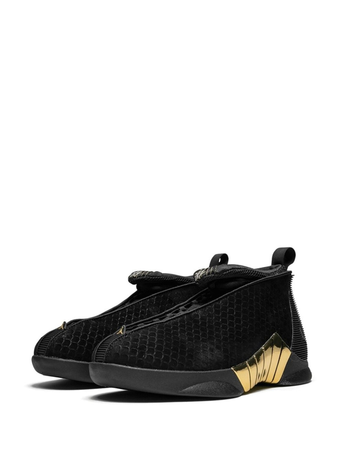 Замшевые кроссовки Air Jordan 15 Retro DB (GS) черного и золотистого цвета от Jordan. Петля для подтягивания сзади, передняя шнуровка, закругленный носок и плоская резиновая подошва.