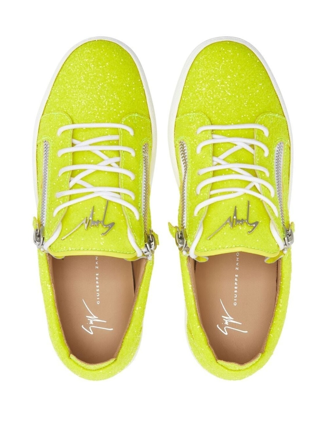 Флуоресцентный желтый, кожа, блестящий материал, закругленный носок, шнуровка спереди, отделка с декоративной молнией, металлический логотип на язычке, стелька с логотипом и плоская резиновая подошва.