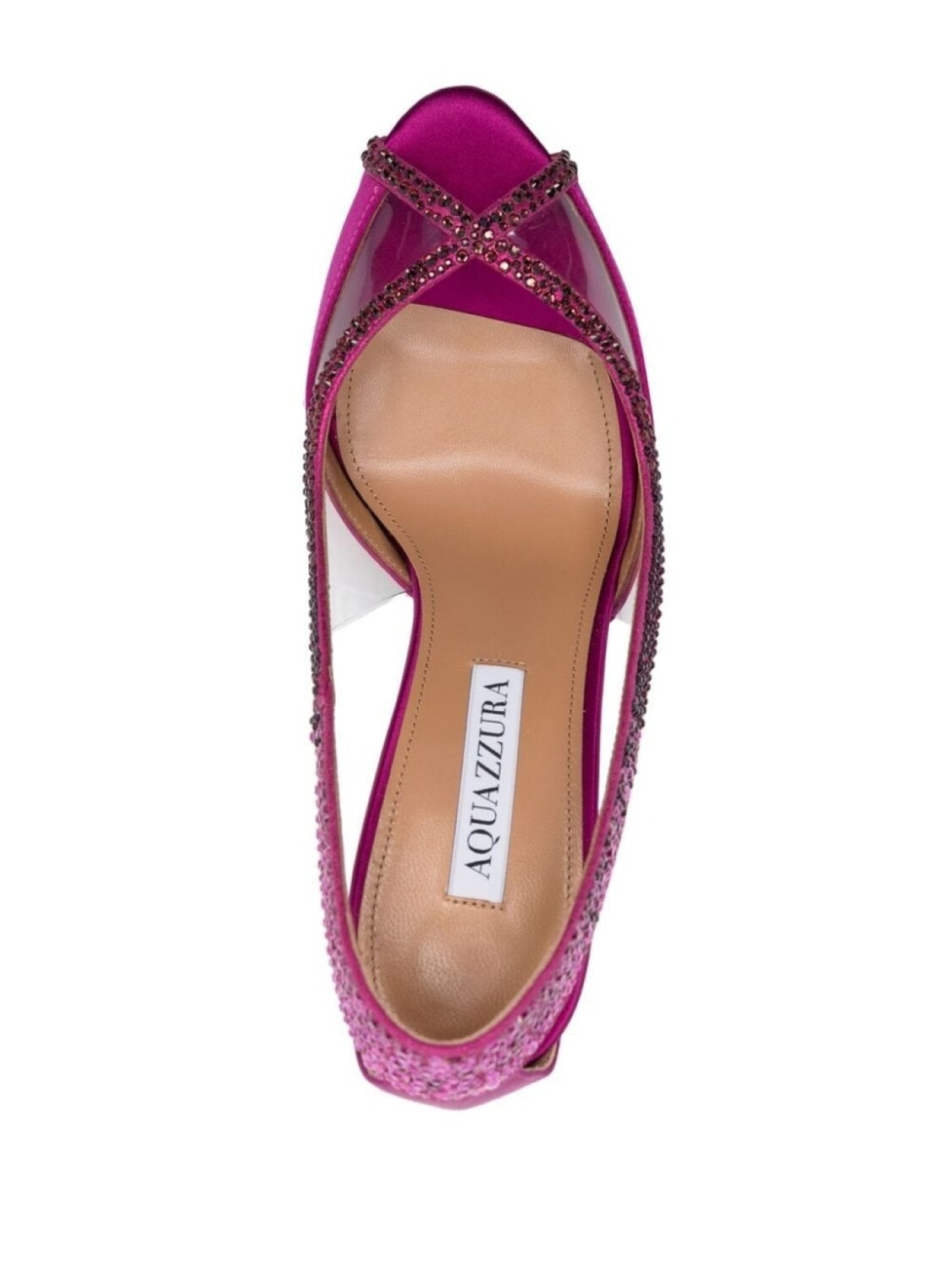 Ярко-розовый, телячья кожа, атласная отделка, декор из кристаллов, открытый носок, стелька с логотипом и каблук на высокой шпильке.