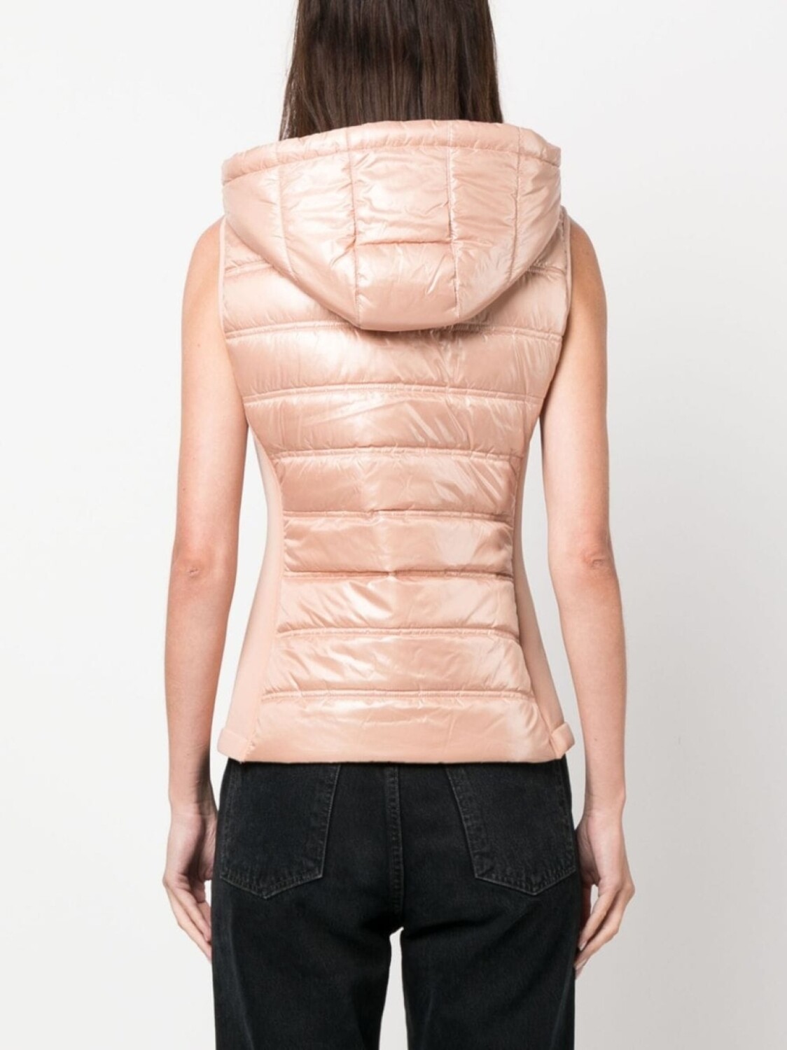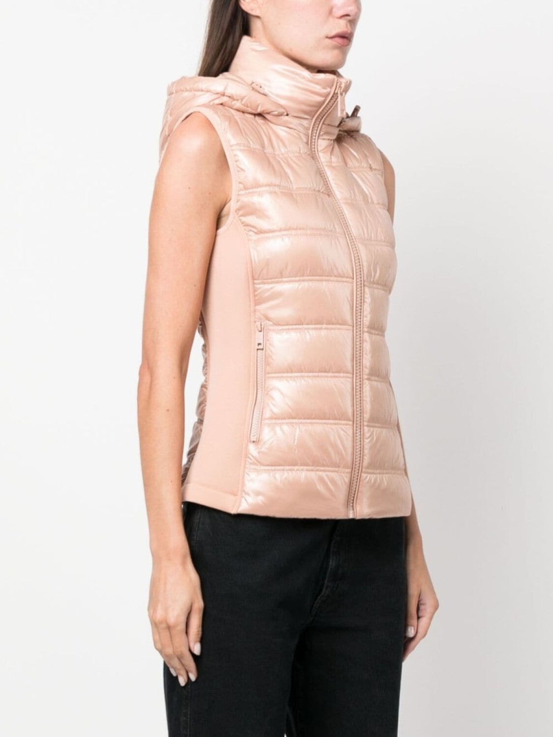 Кораллово-розовый, сатиновая фактура, лакированная отделка, высокий воротник, классический капюшон, застежка на молнии спереди, без рукавов, прямой подол и два кармана на молнии по бокам.