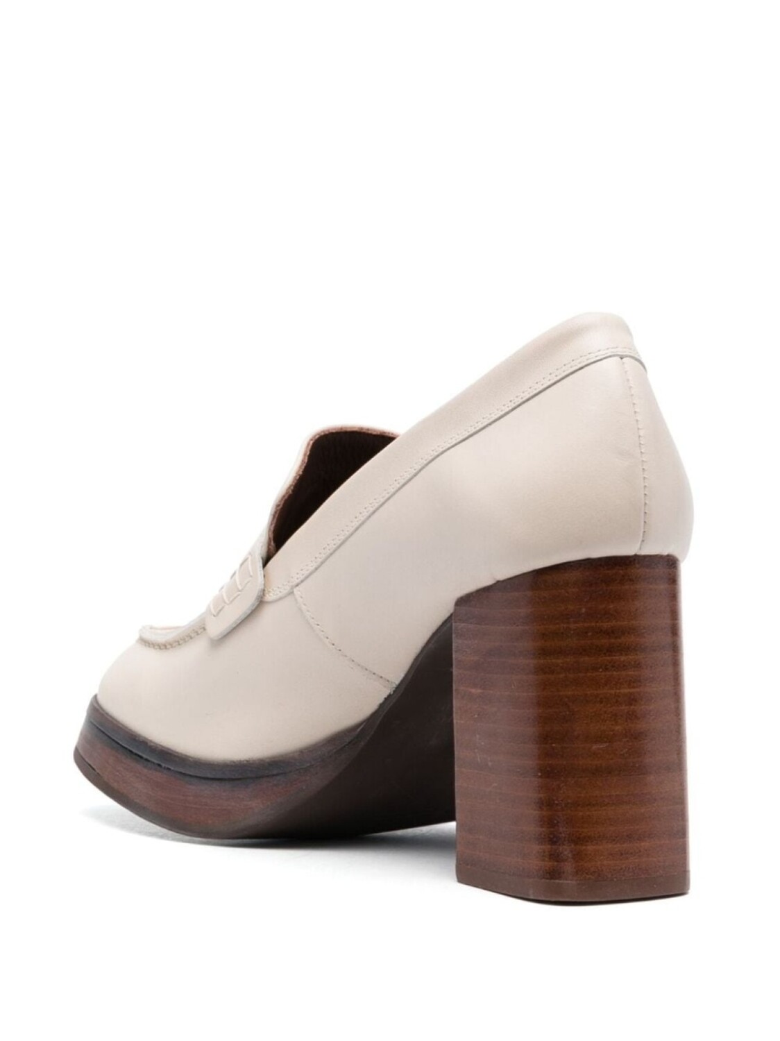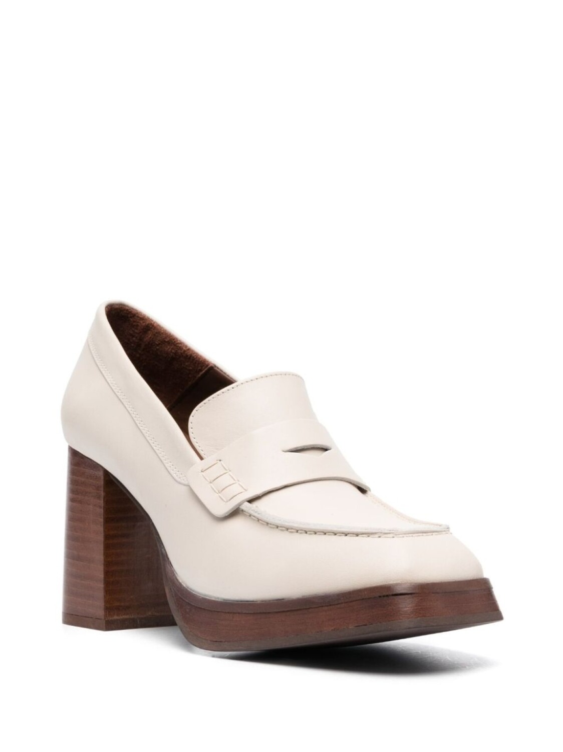 Цвет слоновой кости, кожа, модель без застежки, глянцевая фактура, прорези на язычке, квадратный носок, кожаная стелька с логотипом, кожаная подошва и высокий блочный каблук.
