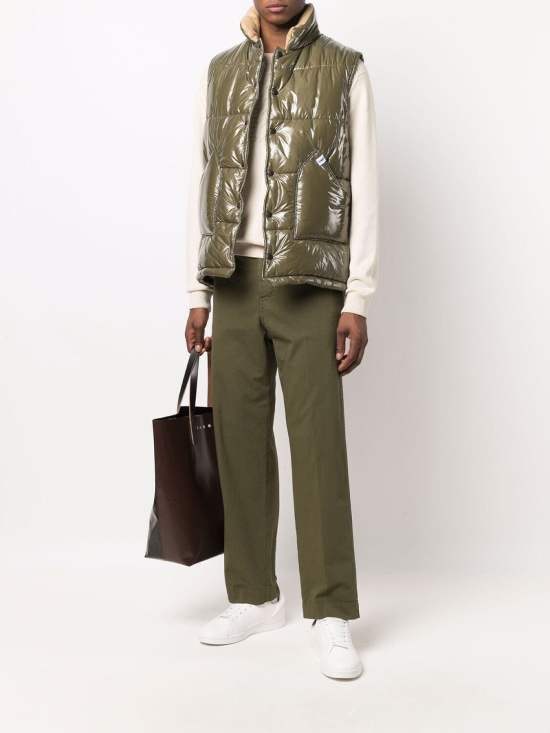 Дутый материал, воротник-труба, два передних кармана, застежка на кнопках спереди и длинные рукава.