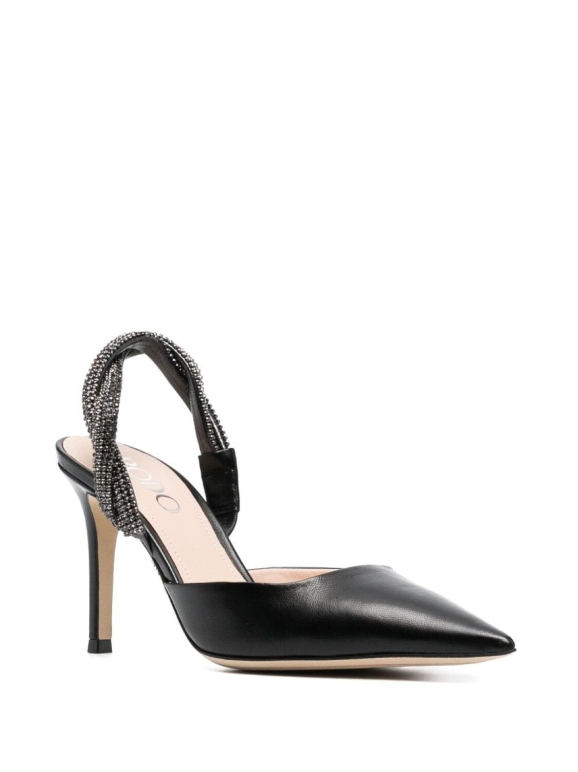 Черный, телячья кожа, кожаная стелька с логотипом, декор из кристаллов, заостренный носок, ремешок на пятке и каблук на высокой шпильке.