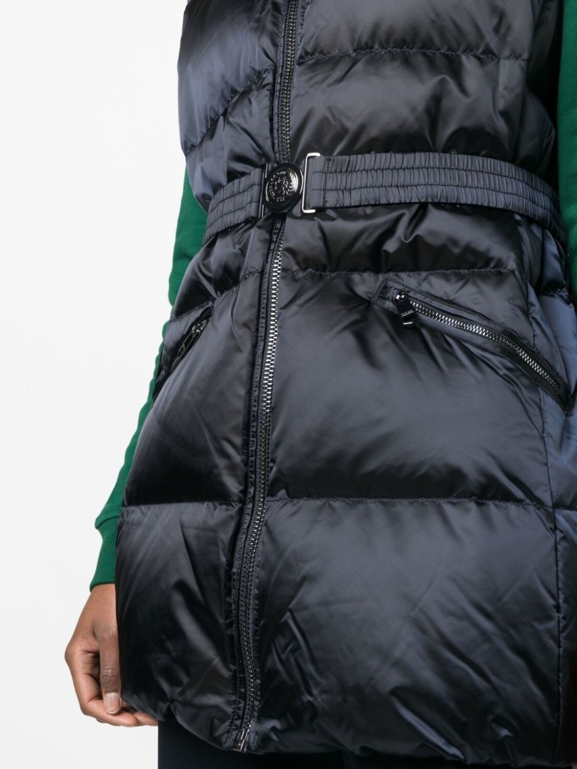 Голубой, утиный пух, наполнитель из пуха и перьев, дутый материал, нашивка с логотипом на груди, высокий воротник, застежка на молнии спереди, без рукавов, прямой подол и два кармана на молнии по бокам.