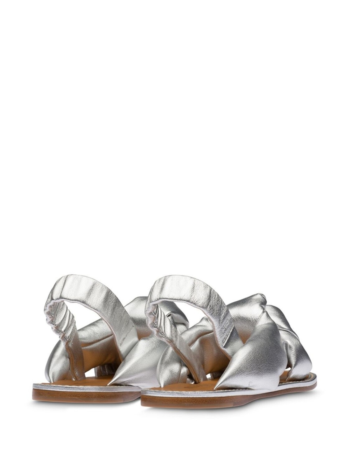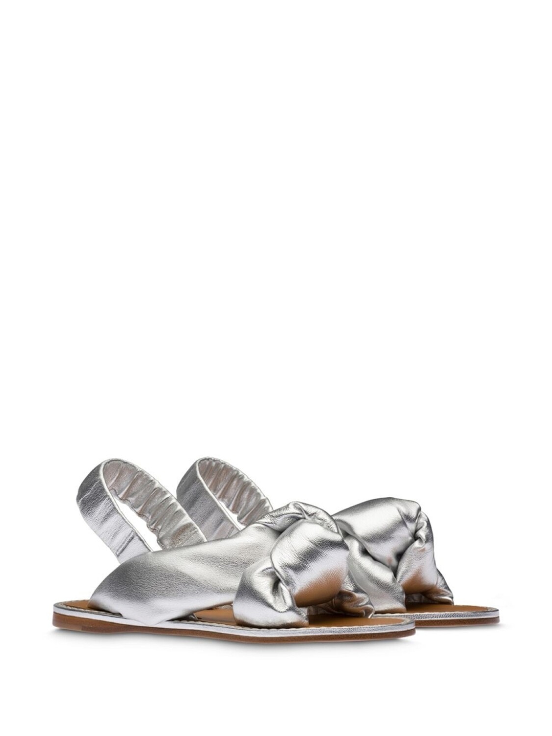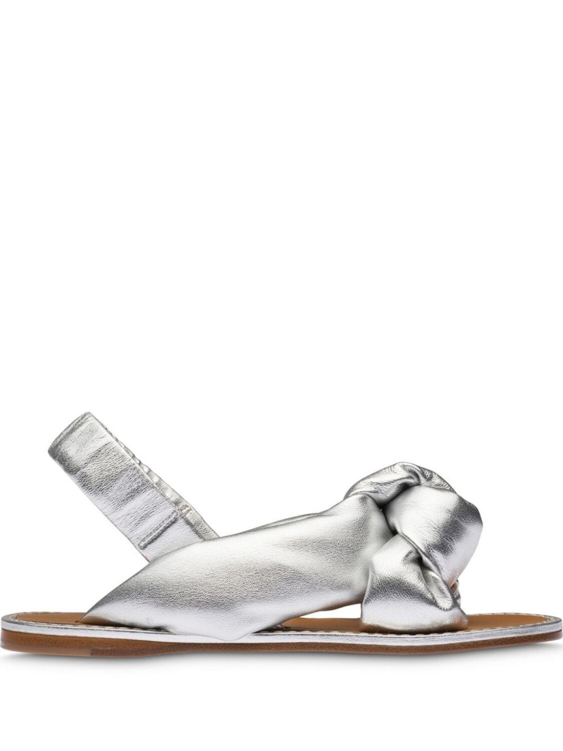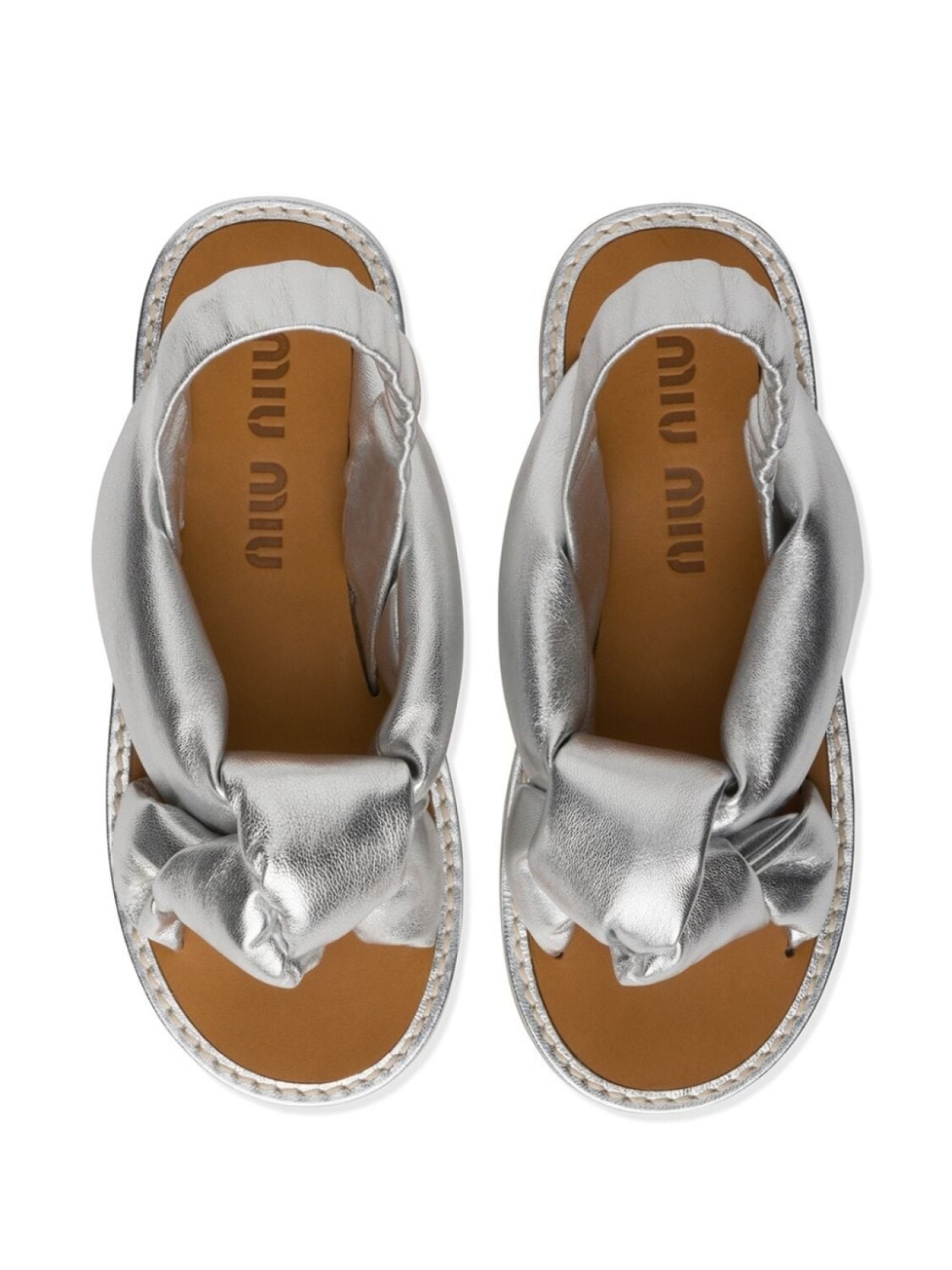 Сандалии с узлом от Miu Miu. Деталь с узелком, открытая пятка и плоская подошва.