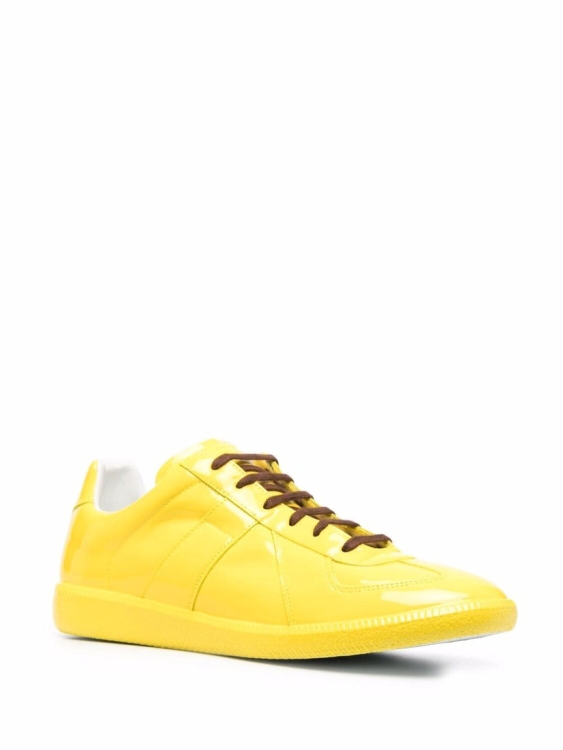 Лакированное покрытие, закругленный носок, шнуровка спереди, стелька с логотипом и плоская резиновая подошва. Цвет: желтый.