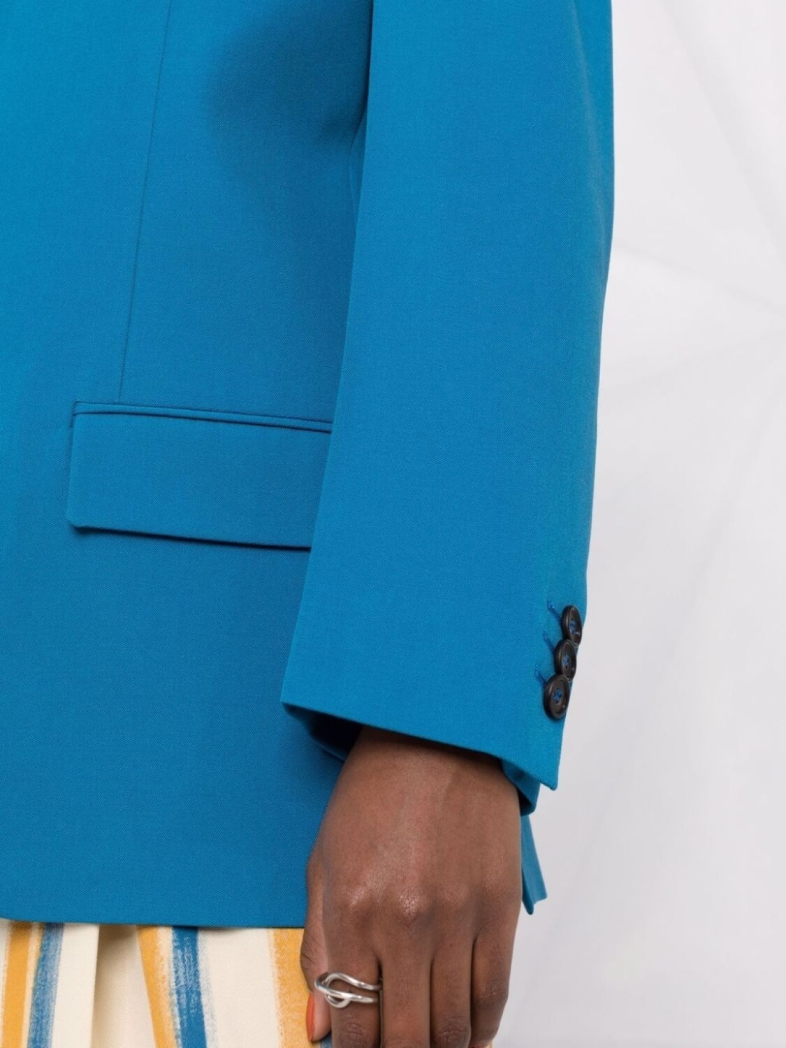 Однотонная расцветка, зазубренные лацканы, длинные рукава, застежка на пуговицах спереди, прорезной карман на груди и два передних кармана с клапанами. Цвет: синий.