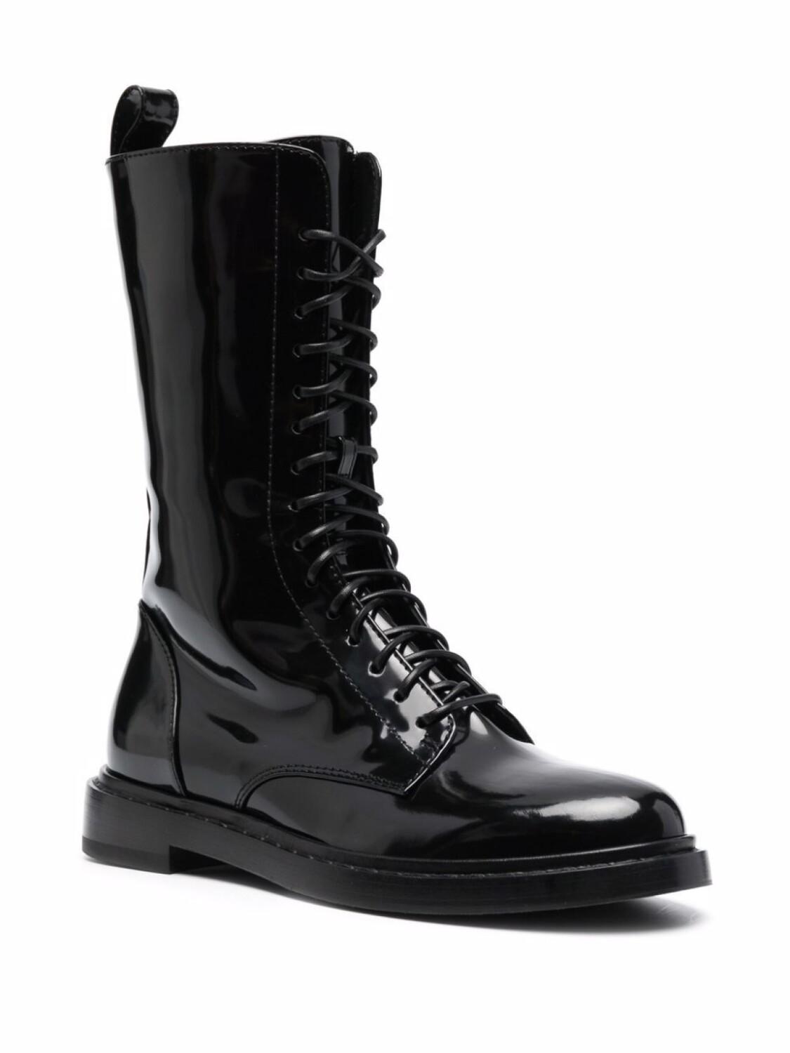 Глянцевая фактура, закругленный носок, шнуровка спереди, застежка на молнии сбоку, петля для подтягивания сзади и низкий блочный каблук. Цвет: черный.