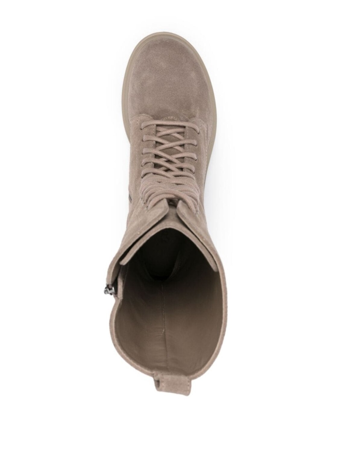 Серый, замша из телячьей кожи, закругленный носок, шнуровка спереди, застежка на молнии сбоку, петля для подтягивания сзади и массивная резиновая подошва c протектором.