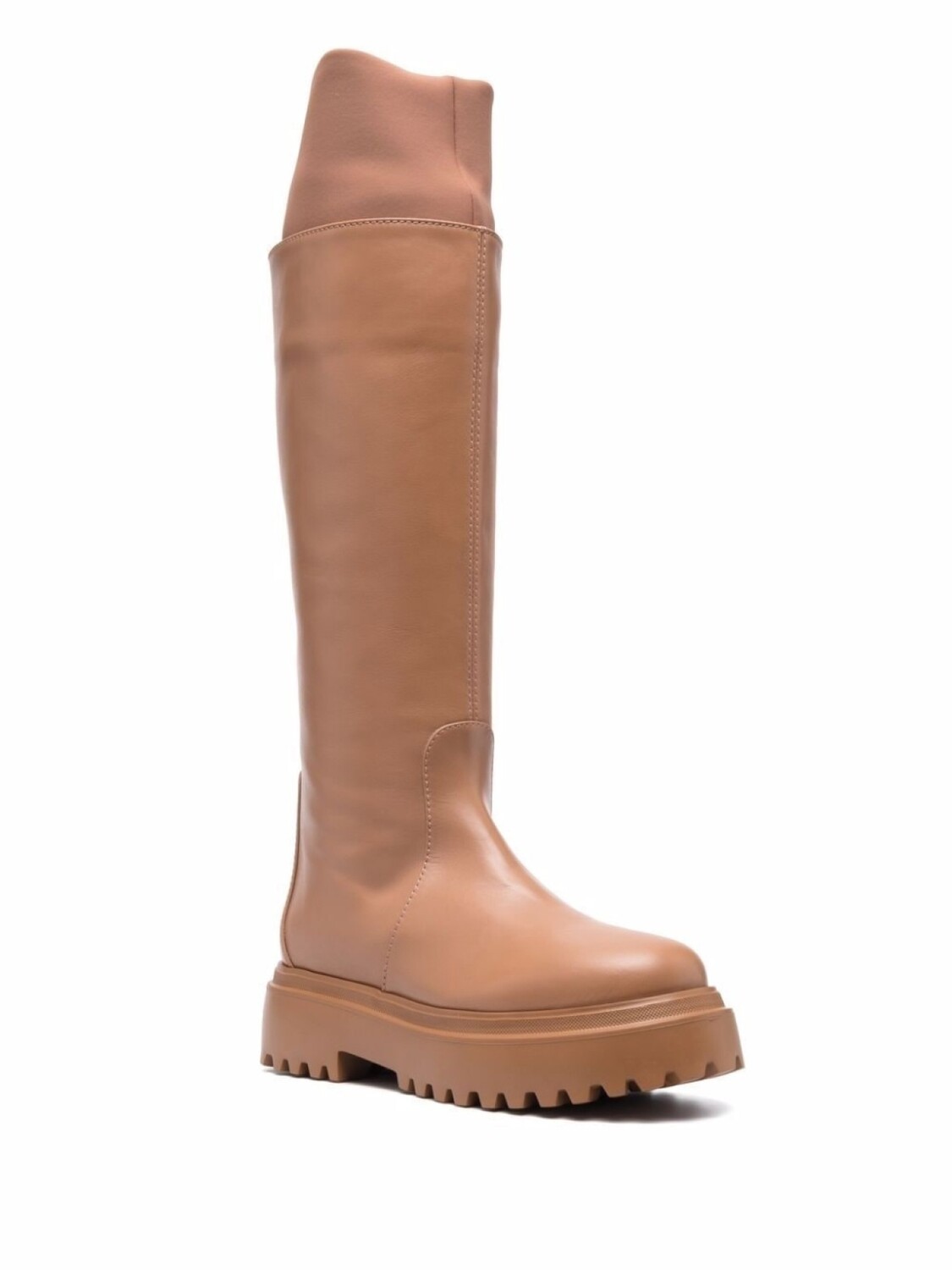 Тональная строчка, миндалевидный носок, длина по колено, подошва на платформе и ребристая резиновая подошва. Цвет: коричневый.