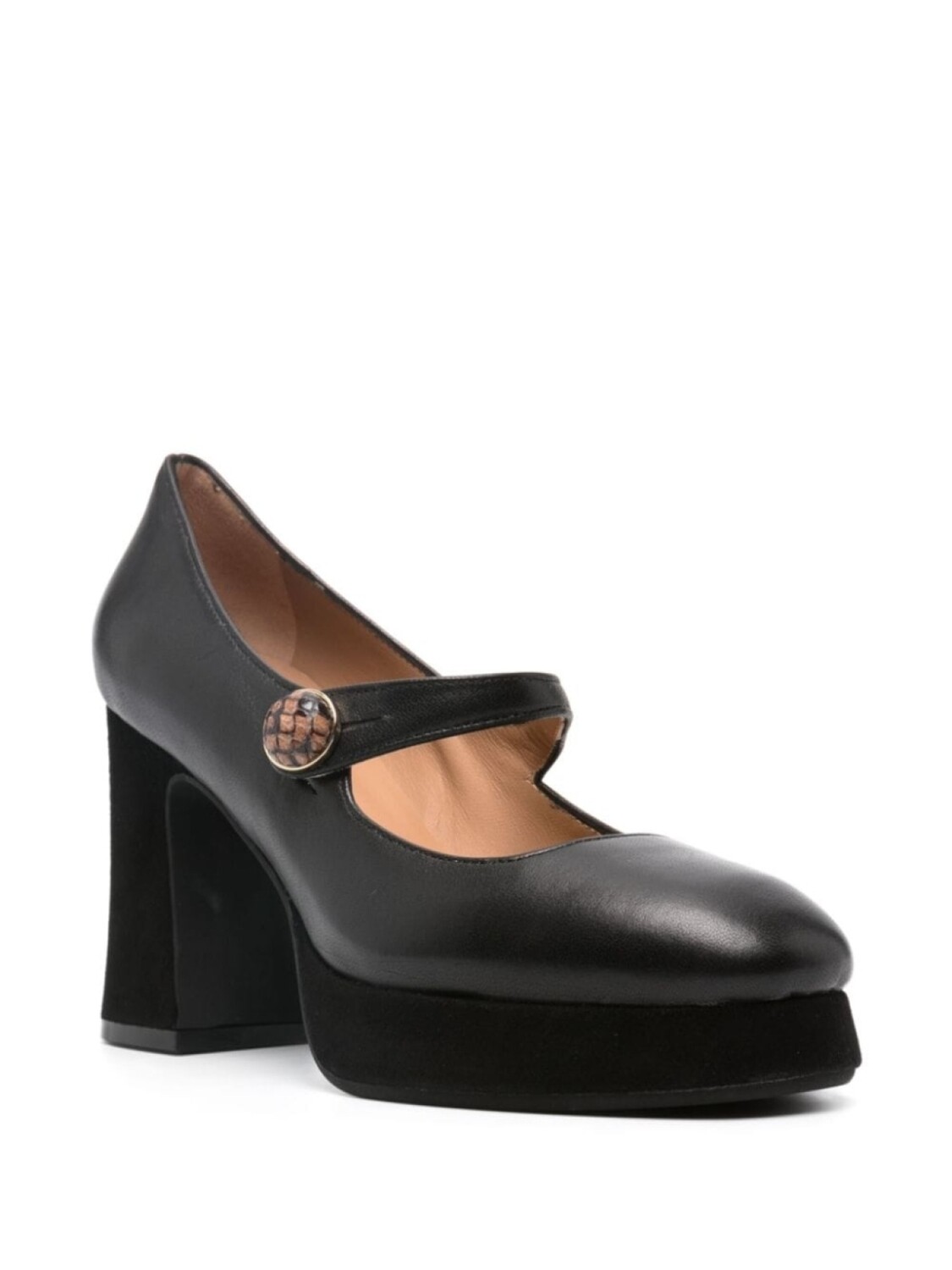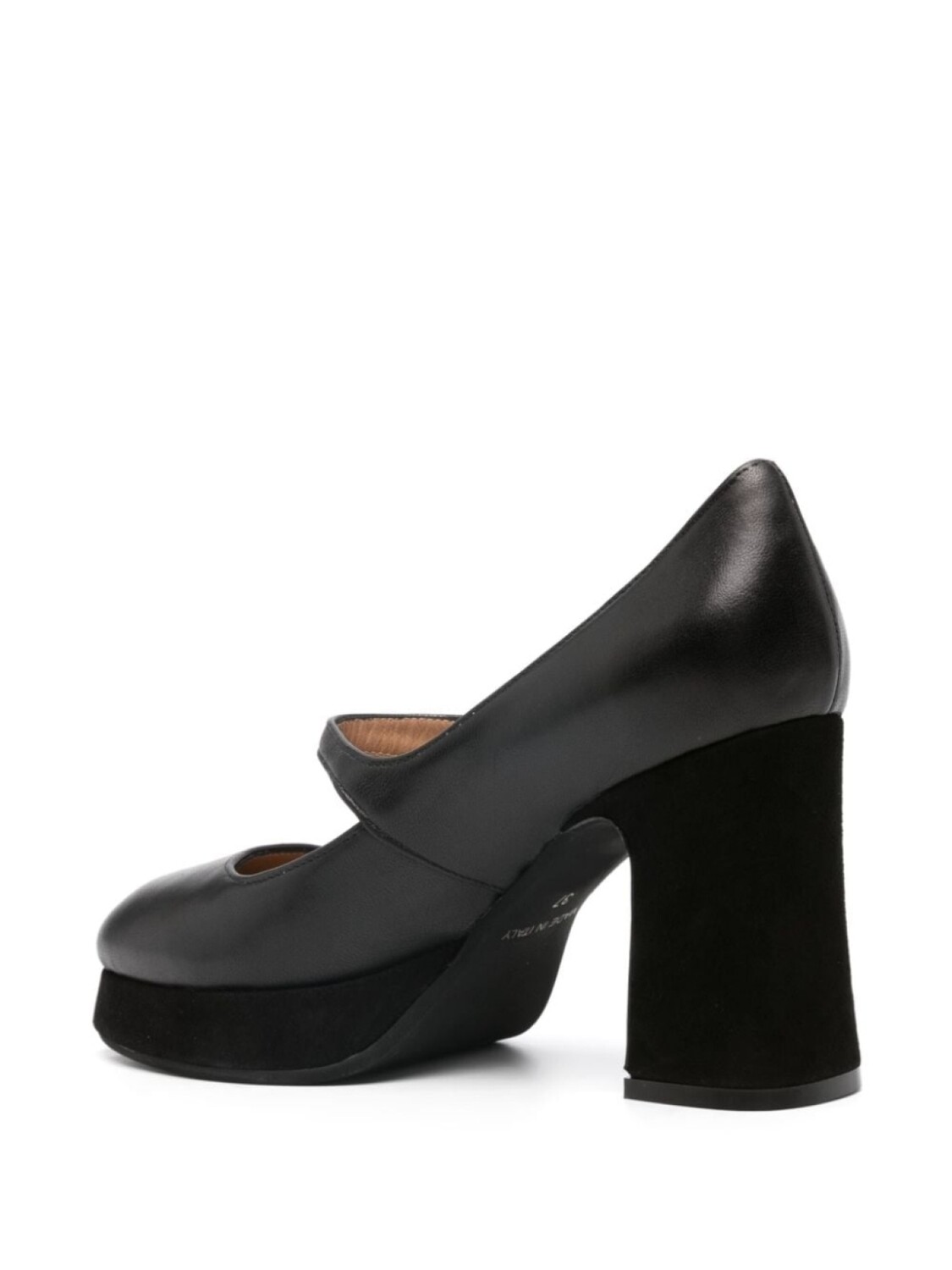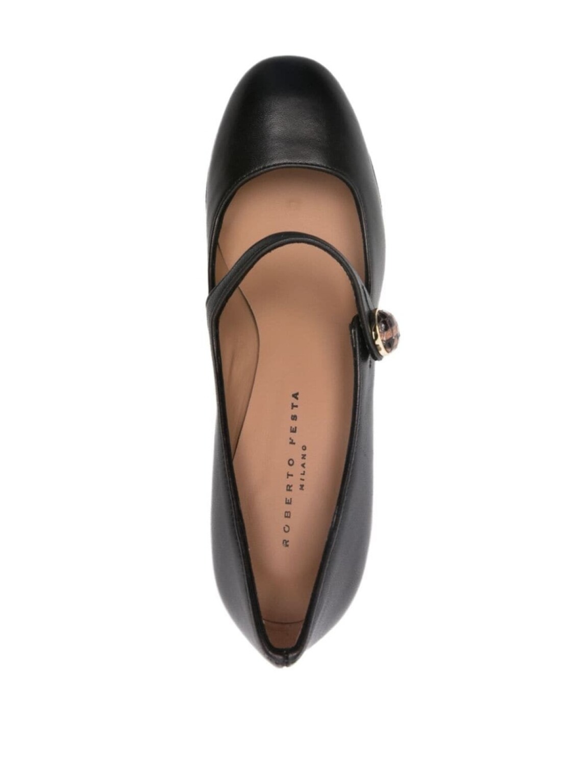Черный, телячья кожа, закругленный носок, бретели с застежками на пуговицах, кожаная стелька с логотипом и высокий блочный каблук.