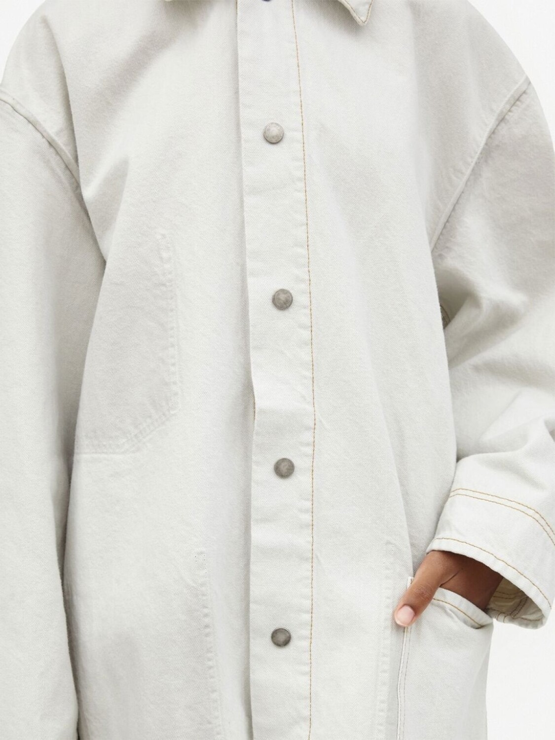 Белый, хлопок, деним, классический воротник, накладной карман спереди, застежка на пуговицах спереди, длинные рукава и прямой подол.