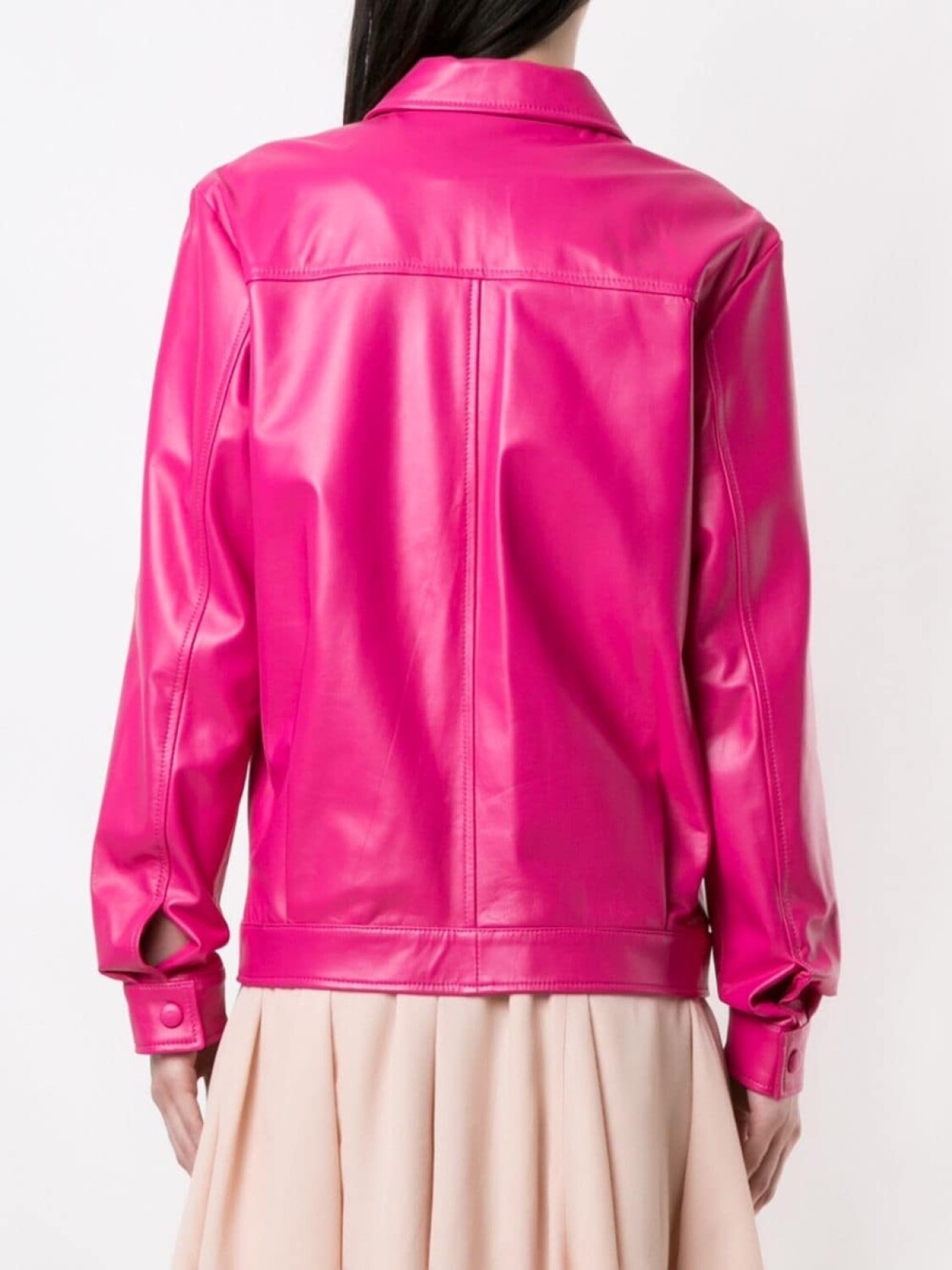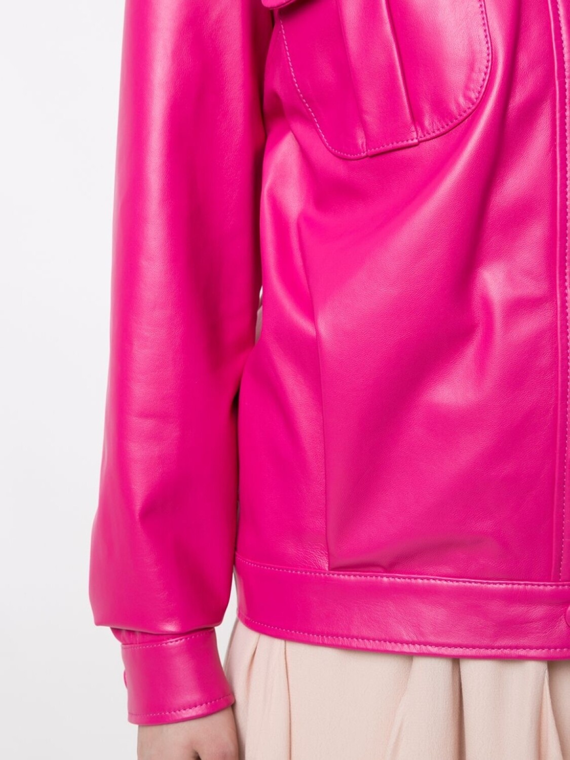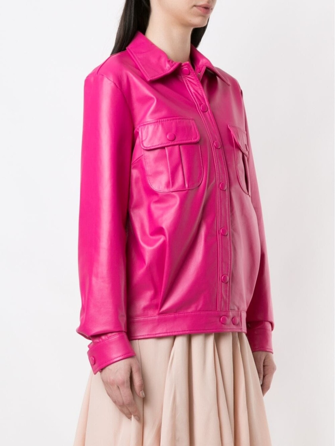 Кожаная куртка Cuir от Olympiah. Классический воротник, застежка на пуговицах спереди, длинные рукава, передние карманы с клапанами, прямой крой и подкладка. Цвет: розовый.