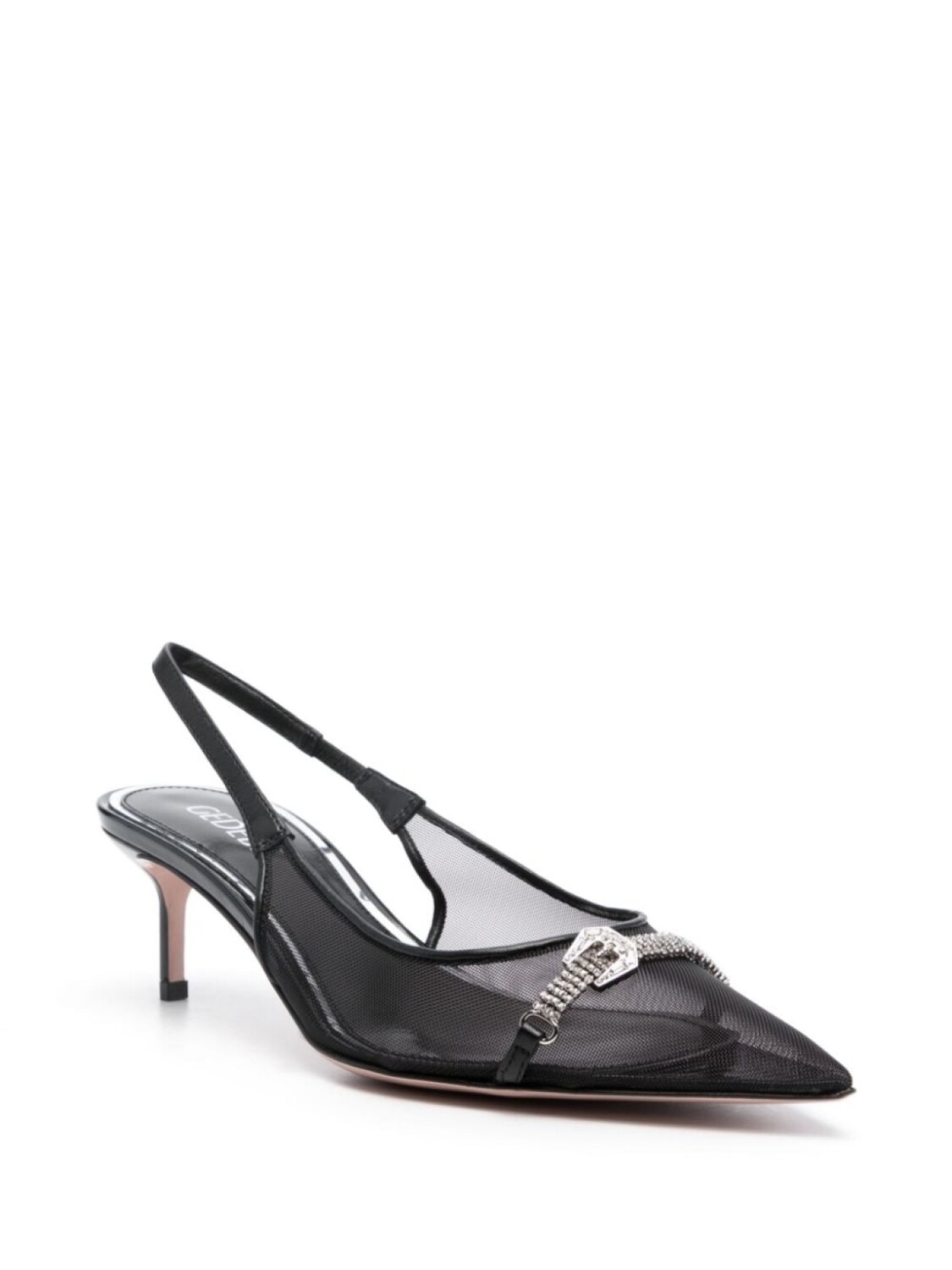 Расцветка Core Black, телячья кожа, сетчатые вставки, декор из кристаллов, заостренный носок, ремешок на пятке, кожаная стелька с логотипом и каблук средней высоты.