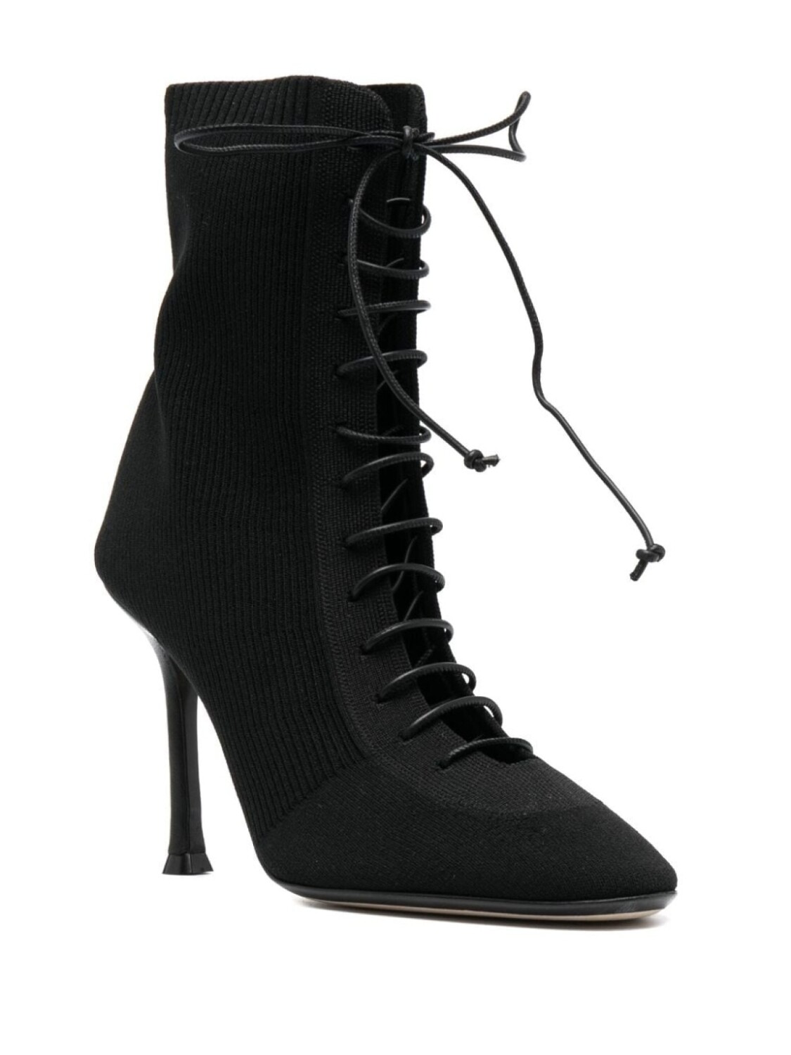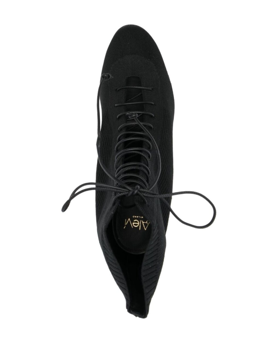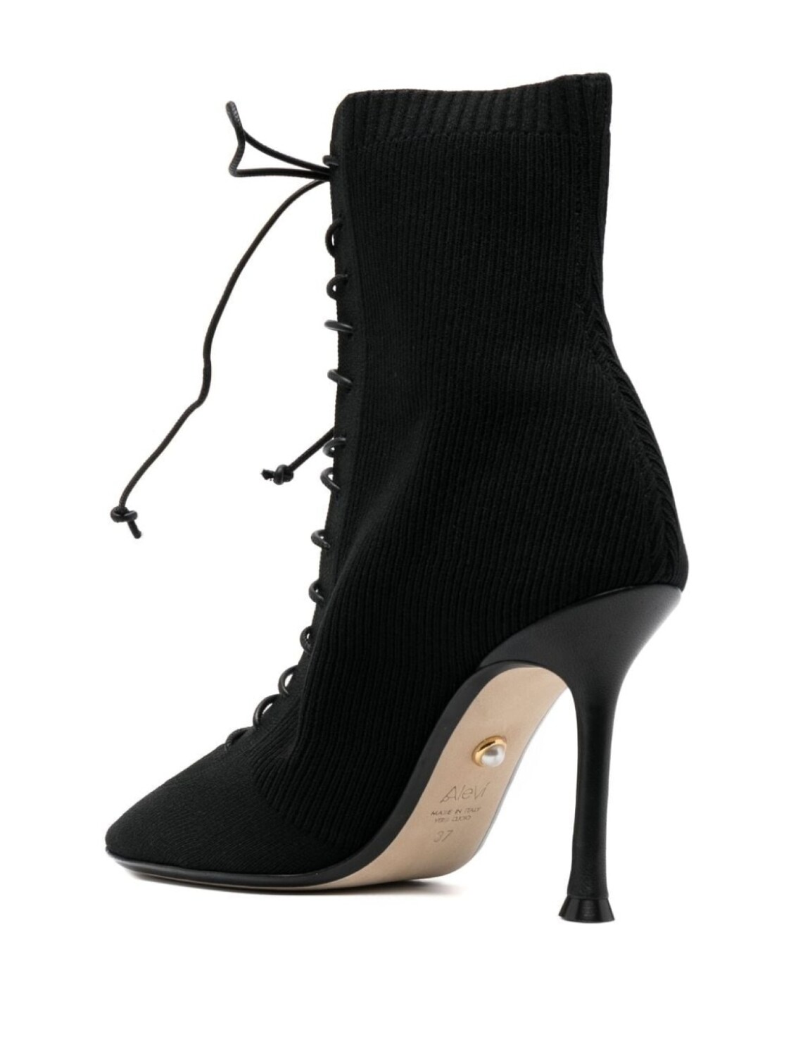 Черный, телячья кожа, трикотаж в рубчик, строчка в тон, заостренный носок, шнуровка спереди, высота по щиколотку и высокий каблук.
