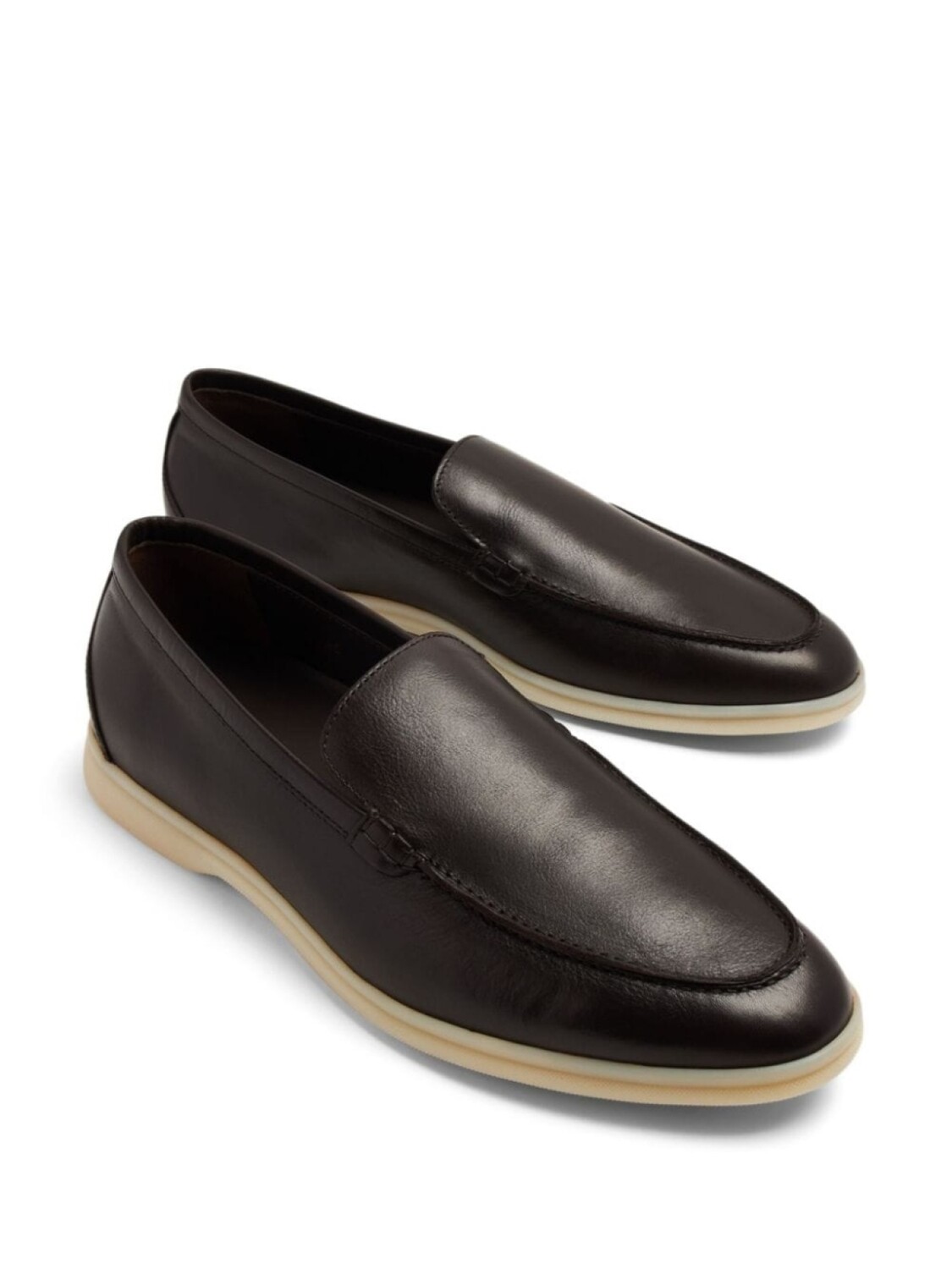 Кофейный, телячья кожа, глянцевая фактура, модель без застежки, прошитые края, миндалевидный носок, кожаная стелька с логотипом и плоская резиновая подошва.