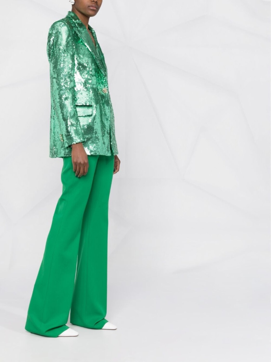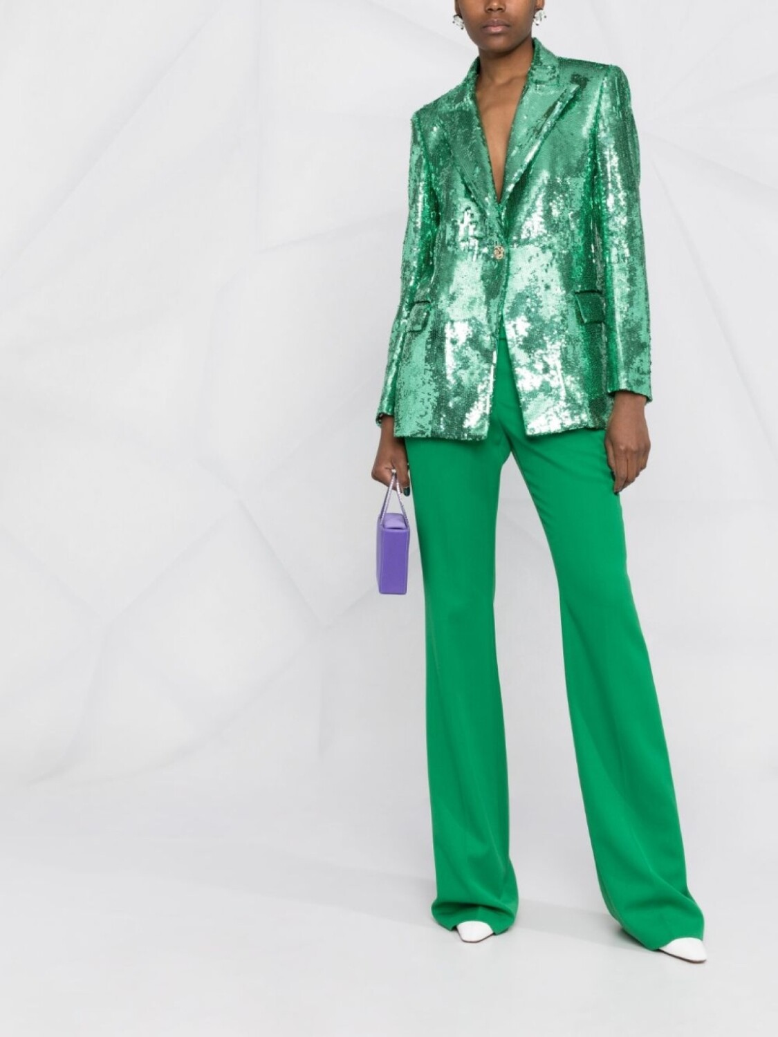 Украшение из пайеток, заостренные лацканы, застежка на пуговицы и длинные рукава. Цвет: зеленый.