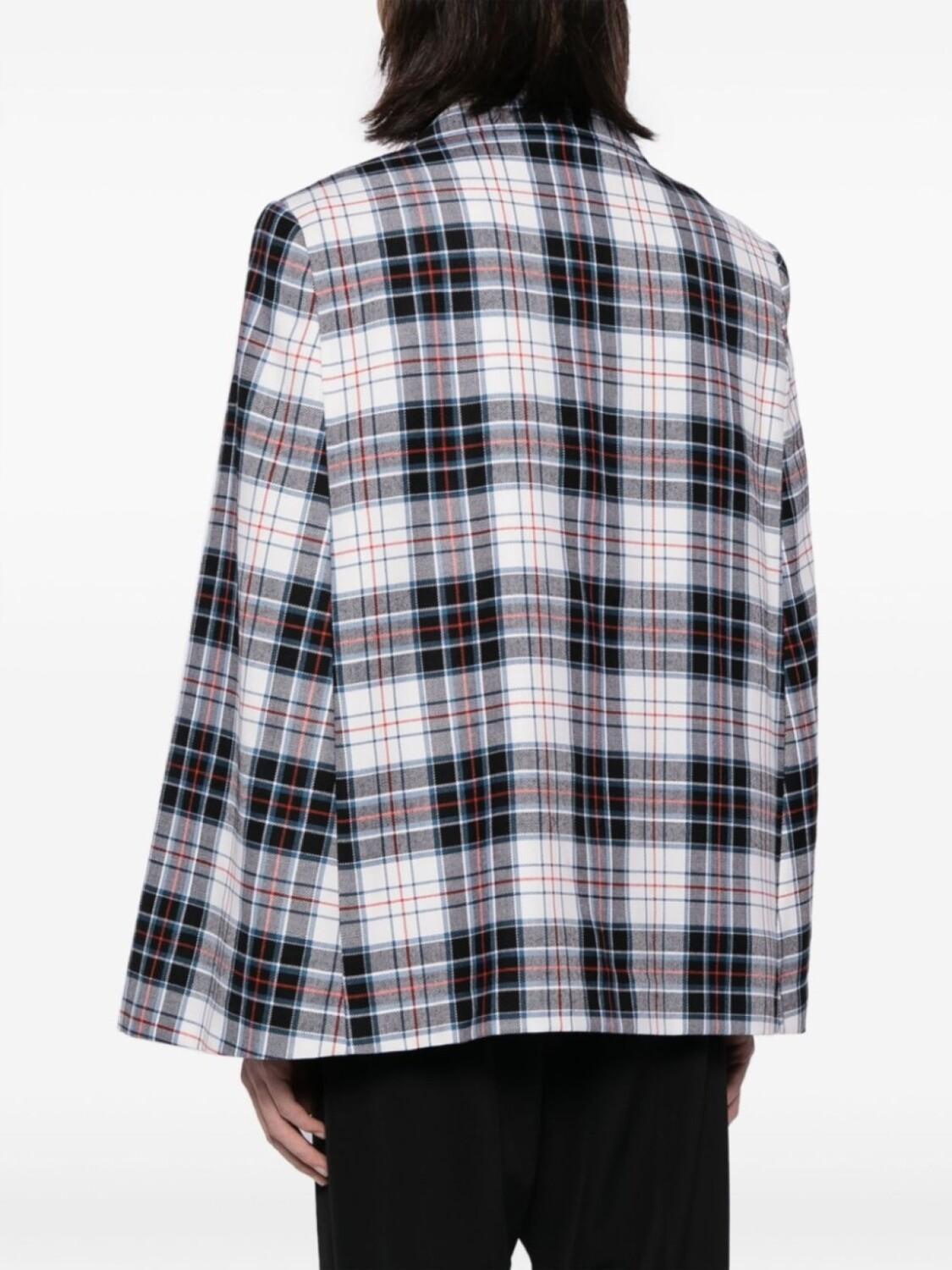 Черный/разноцветный, шерсть, клетчатый узор, заостренные лацканы, двубортная застежка на кнопки, прорезной карман на груди, два передних кармана с клапанами, длинные рукава и прямой подол.