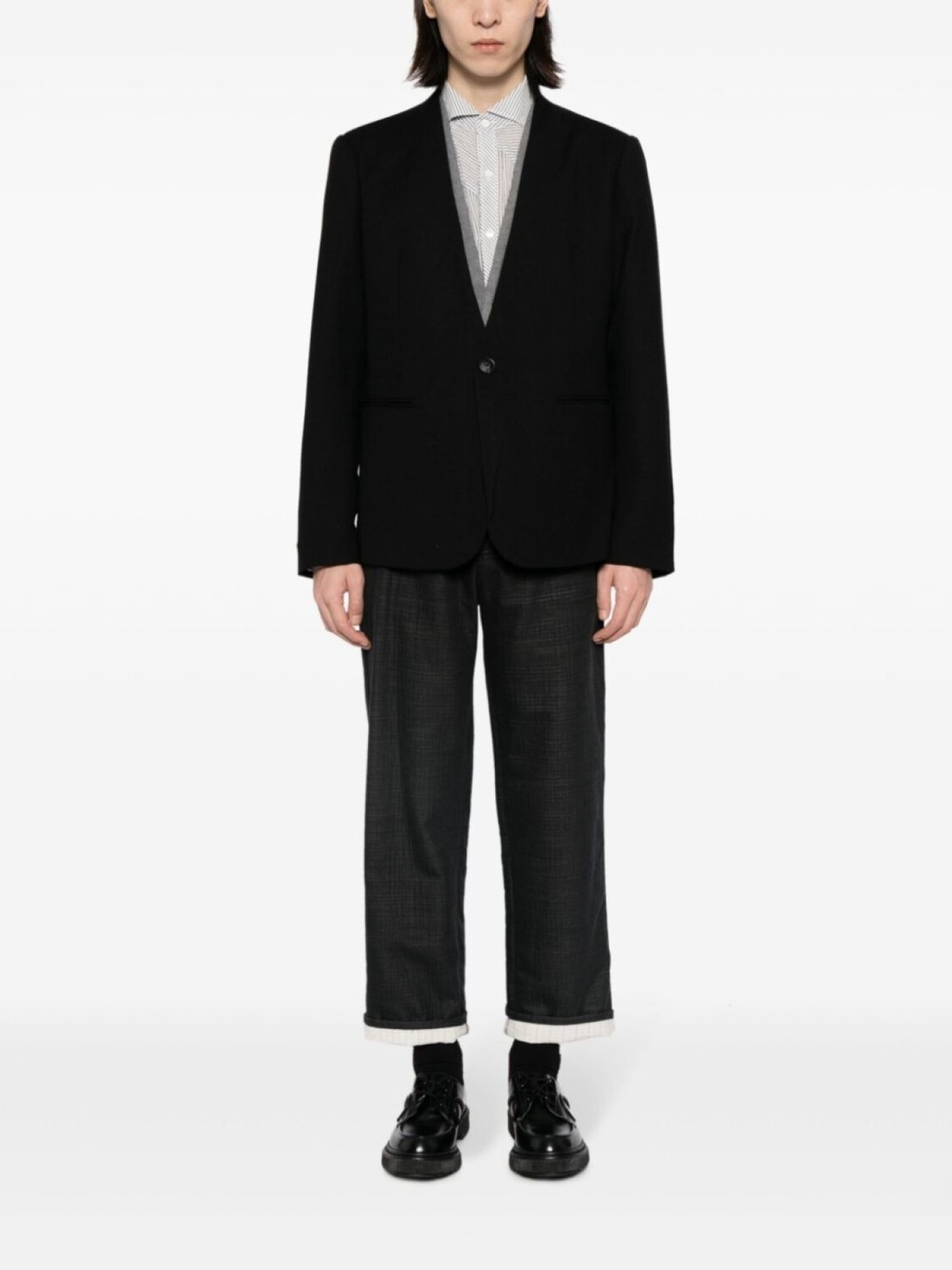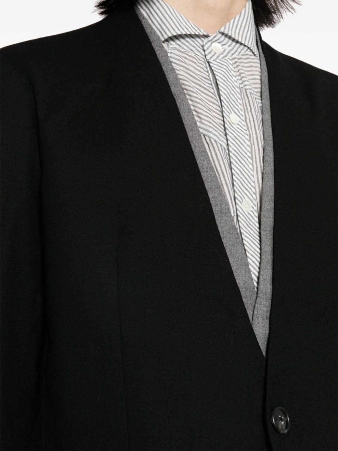 Черный, шерсть, контрастная отделка, V-образный вырез, без лацканов, застежка на пуговицах спереди, два передних кармана с листочкой, длинные рукава, манжеты на пуговицах и закругленный подол.