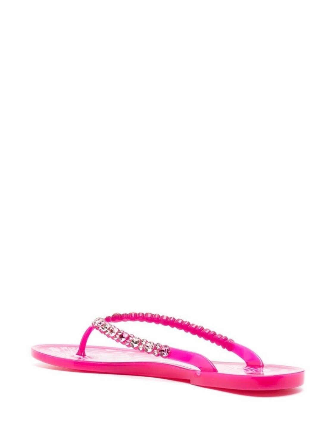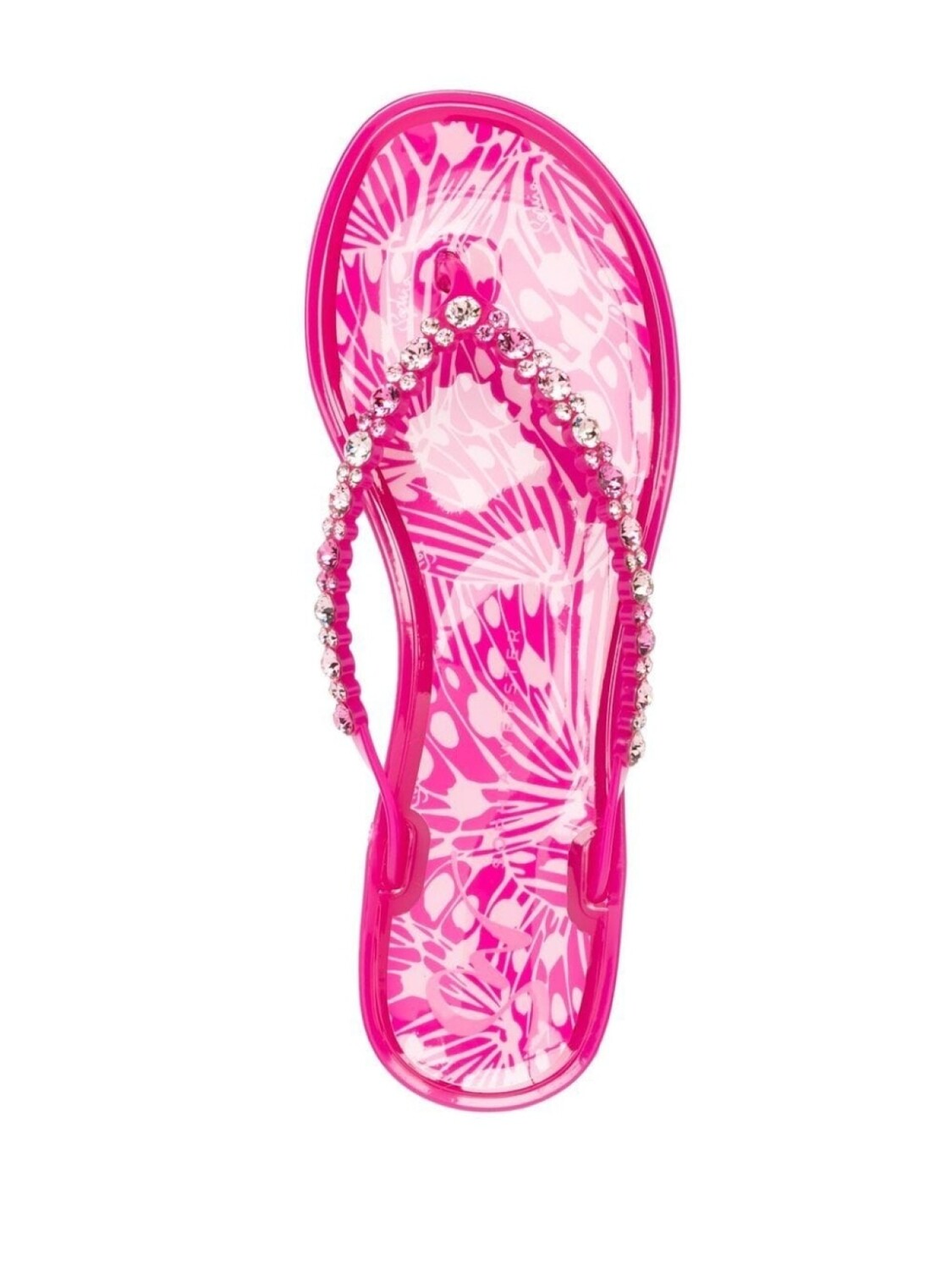 Фуксия, белый, глянцевый финиш, модель без застежки, декор из кристаллов, сплошной графичный принт, Т-образный ремешок, открытый носок, стелька с логотипом и плоская подошва.