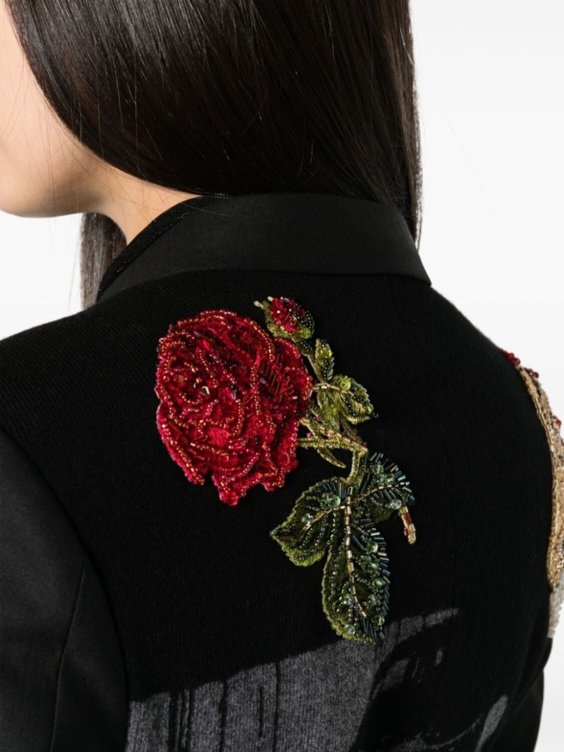 Черный, разноцветный, смесь шерсти и шелка, декор из бисера, аппликация, заостренные лацканы, застежка на пуговицах спереди, рукава три четверти, манжеты на пуговицах, прорезной карман на груди, два передних кармана с клапанами и прямой подол.