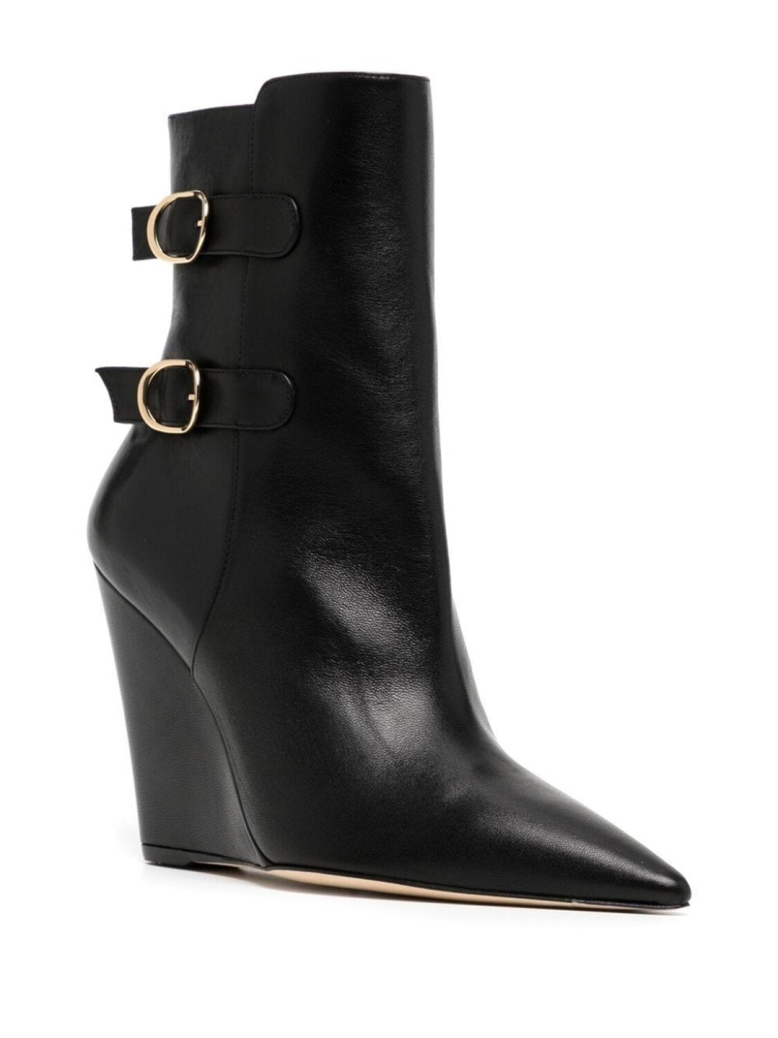 Черный, кожа, заостренный носок, боковые застежки с пряжками и высокая танкетка.
