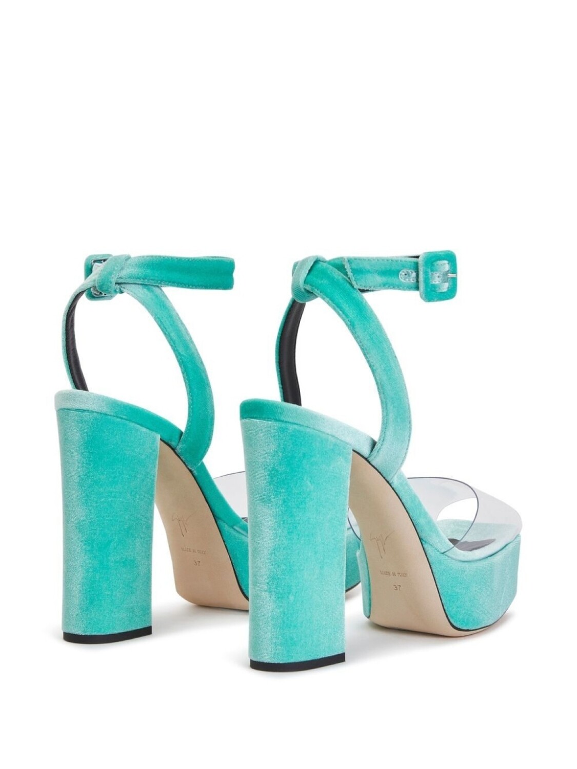 Сине-зеленый, кожаная подкладка, бархатный эффект, прозрачный материал, стелька с логотипом, открытый носок, ремешок на щиколотке с пряжкой и высокий блочный каблук.