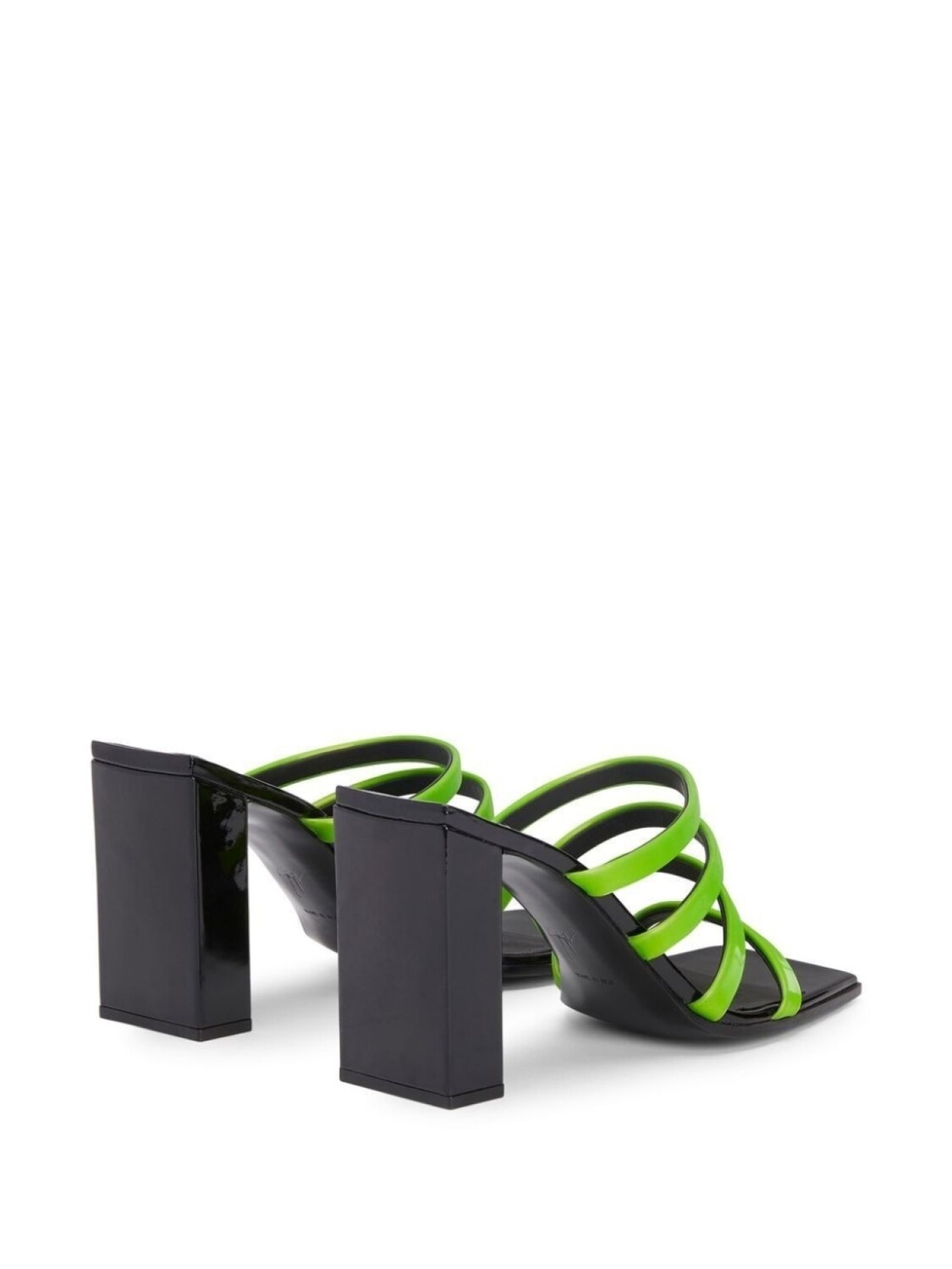 Флуоресцентный зеленый, черный, стелька с логотипом, открытый носок, модель без застежки и высокий блочный каблук.