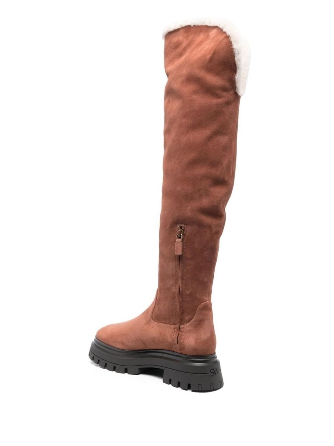 Коричнево-терракотовый, телячья кожа, тисненый логотип сзади, подкладка из овечьей шерсти, застежки на молнии сбоку, закругленный носок, массивная резиновая подошва c протектором и высота до линии бедра.