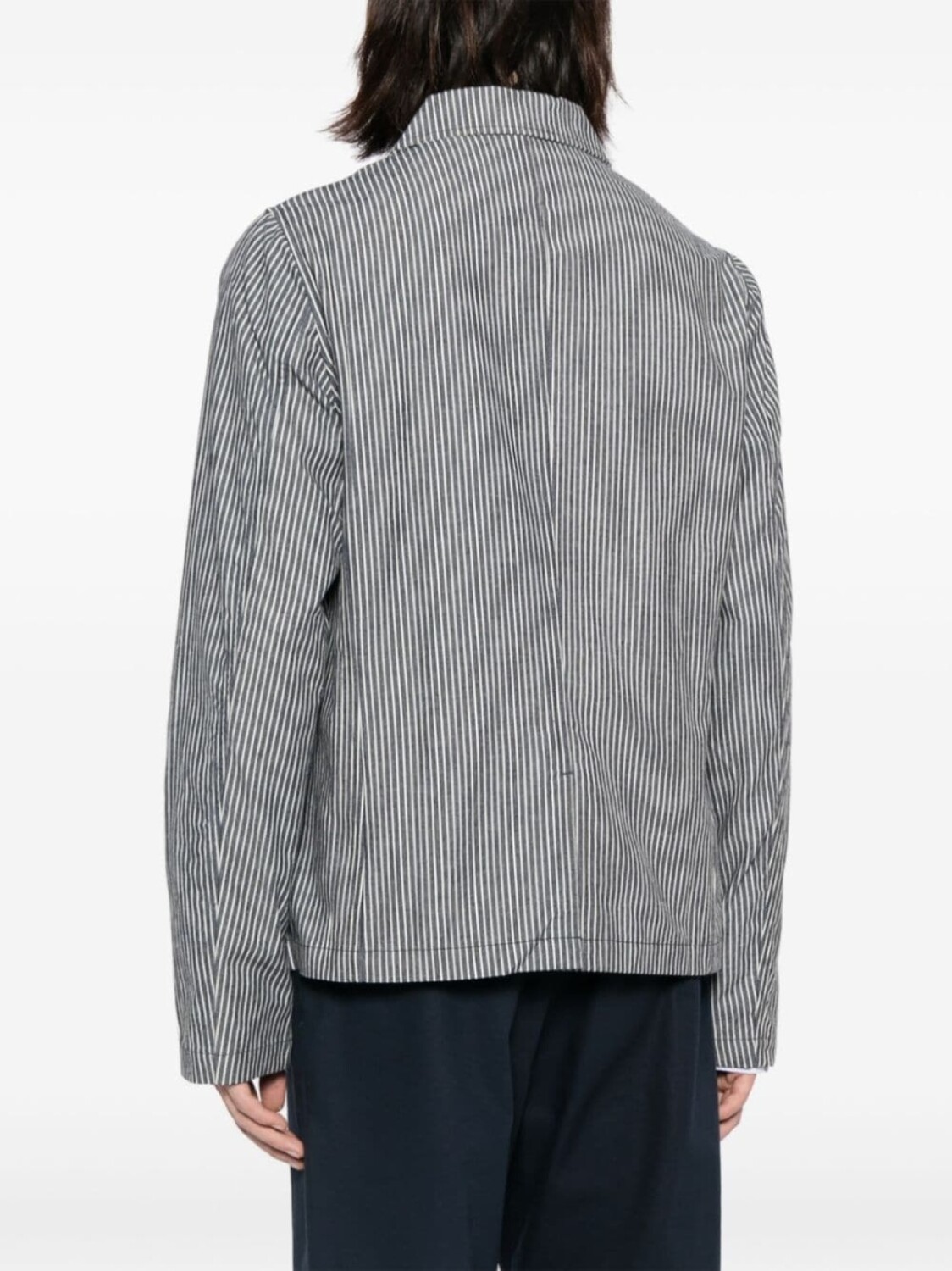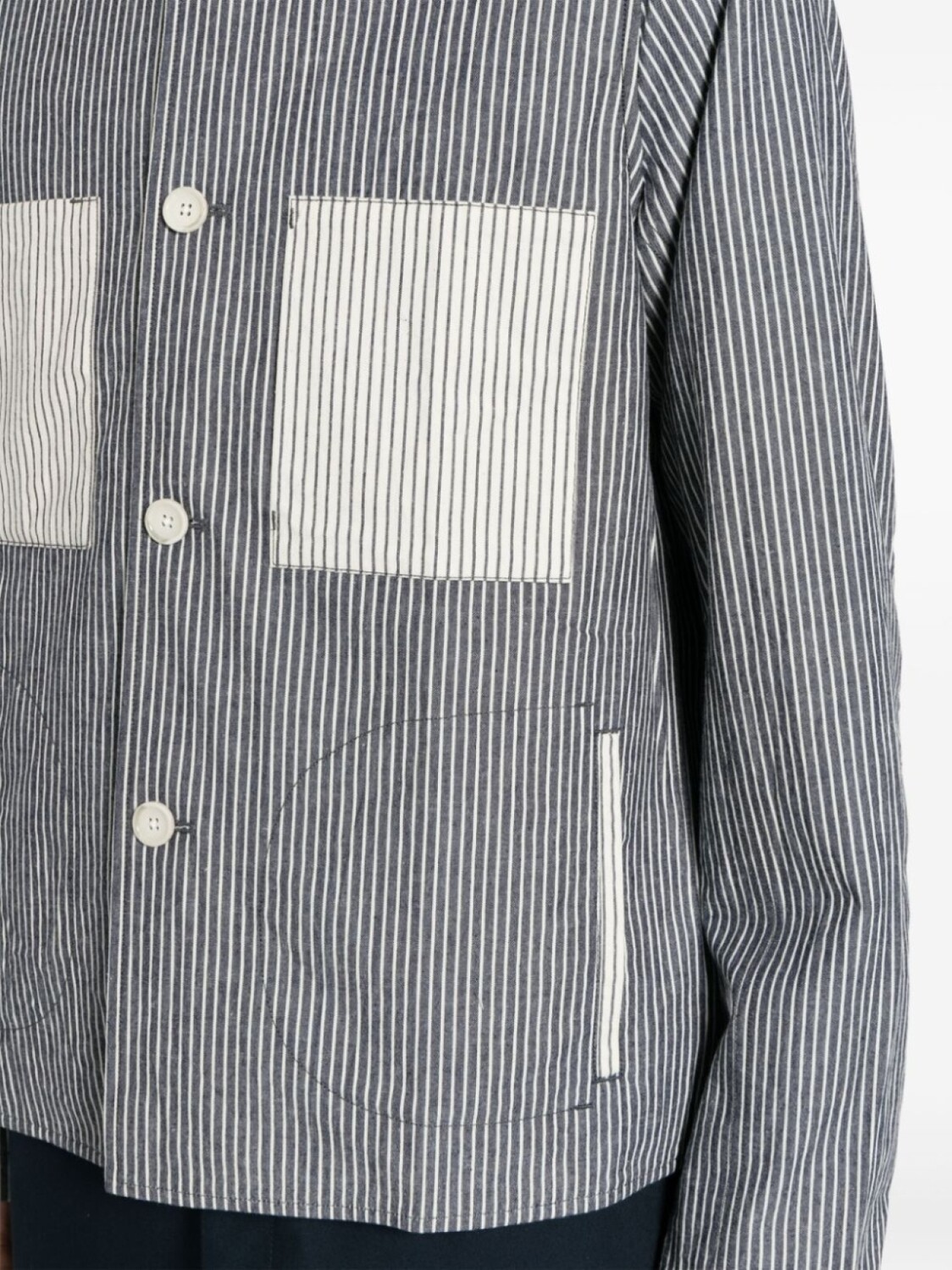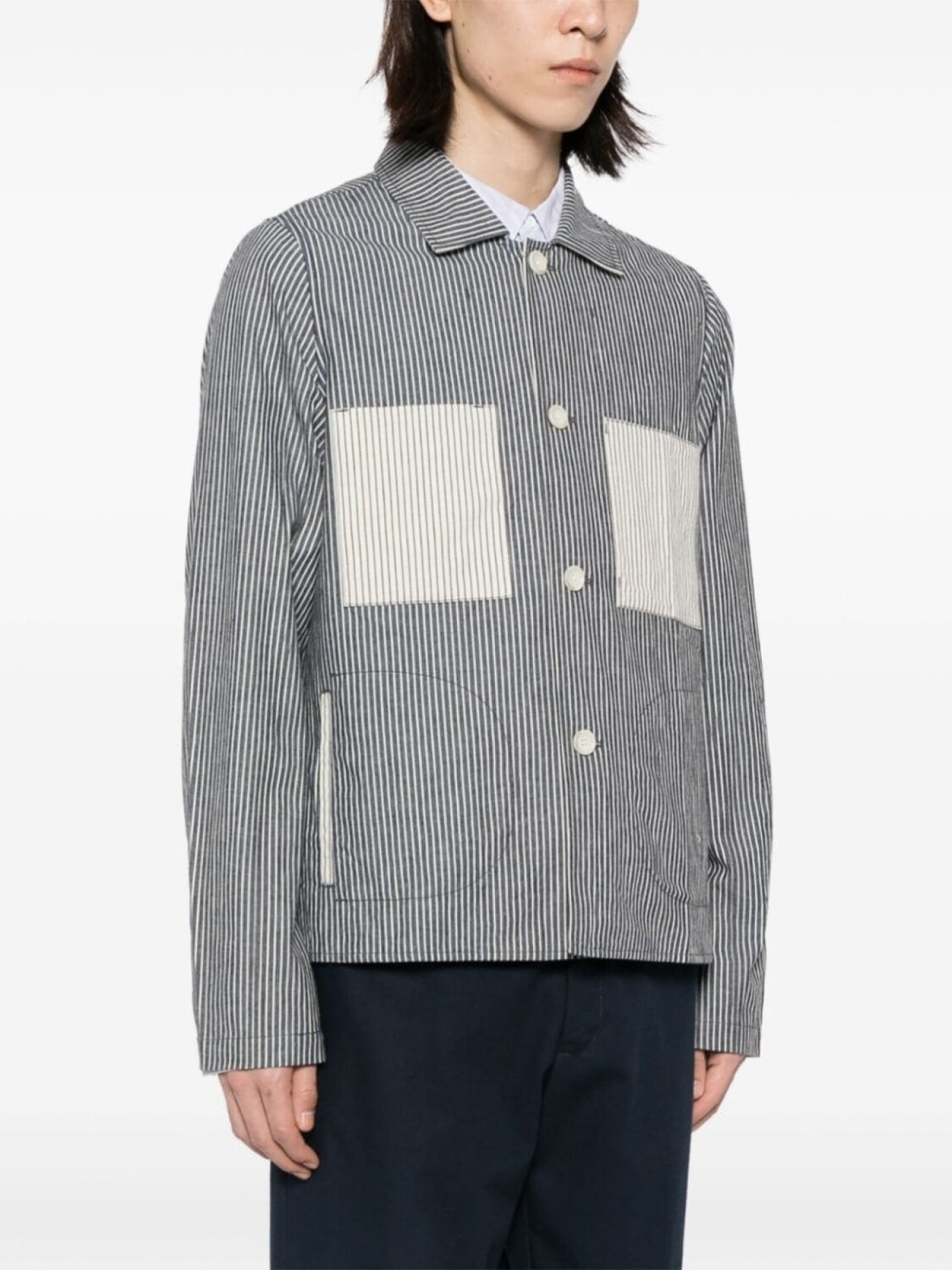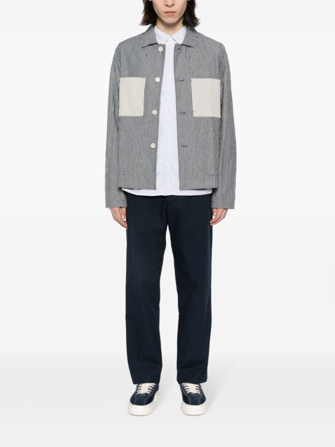Темно-синий, белый, хлопок, сочетание двух оттенков, узор в вертикальную полоску, отложной воротник, застежка на пуговицах спереди, длинные рукава, два накладных кармана на груди, два прорезных кармана сбоку и прямой подол.