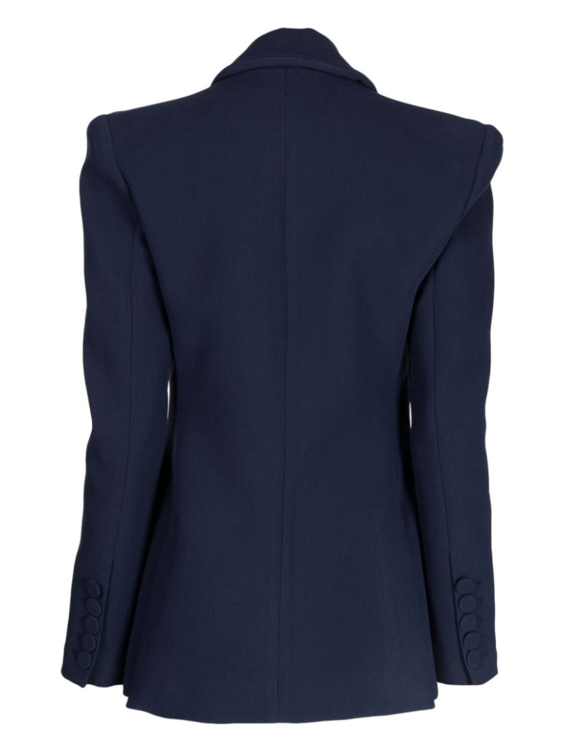 Темно-синий, заостренные лацканы, подплечники, прорезной карман на груди, застежка на пуговицах спереди, приталенный силуэт, два передних кармана с клапанами, рукава с манжетами на пуговицах, длинные рукава и прямой подол.