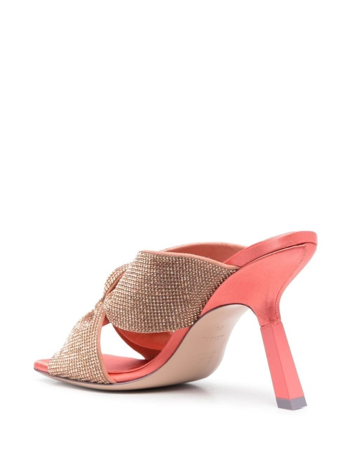 Кораллово-розовый, телячья кожа, декор из кристаллов, открытый носок, стелька с логотипом и высокий каблук.