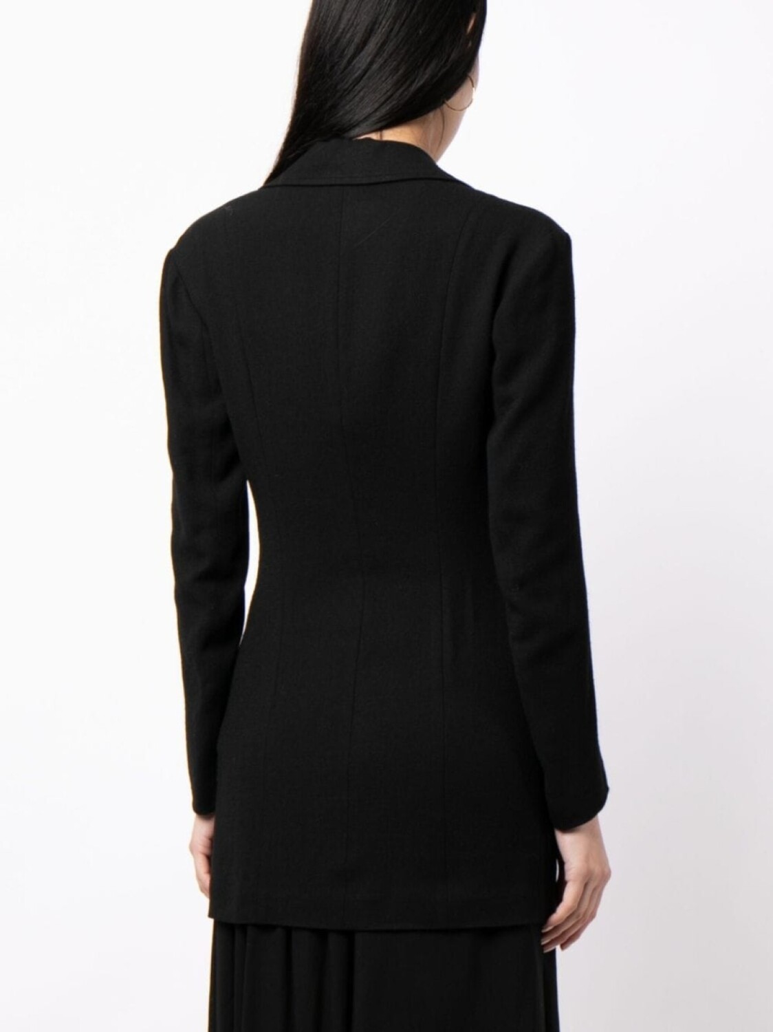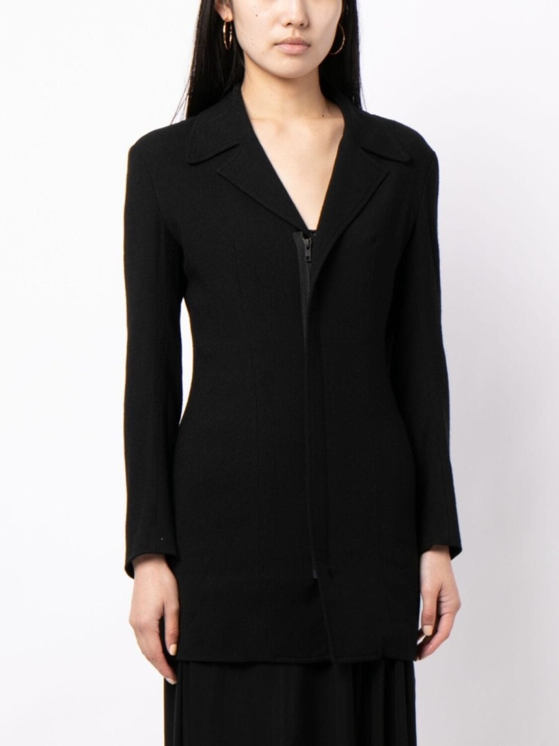 Черный, смесовая шерсть, V-образный вырез, зазубренные лацканы, длинные рукава, потайная молния спереди и прямой подол.