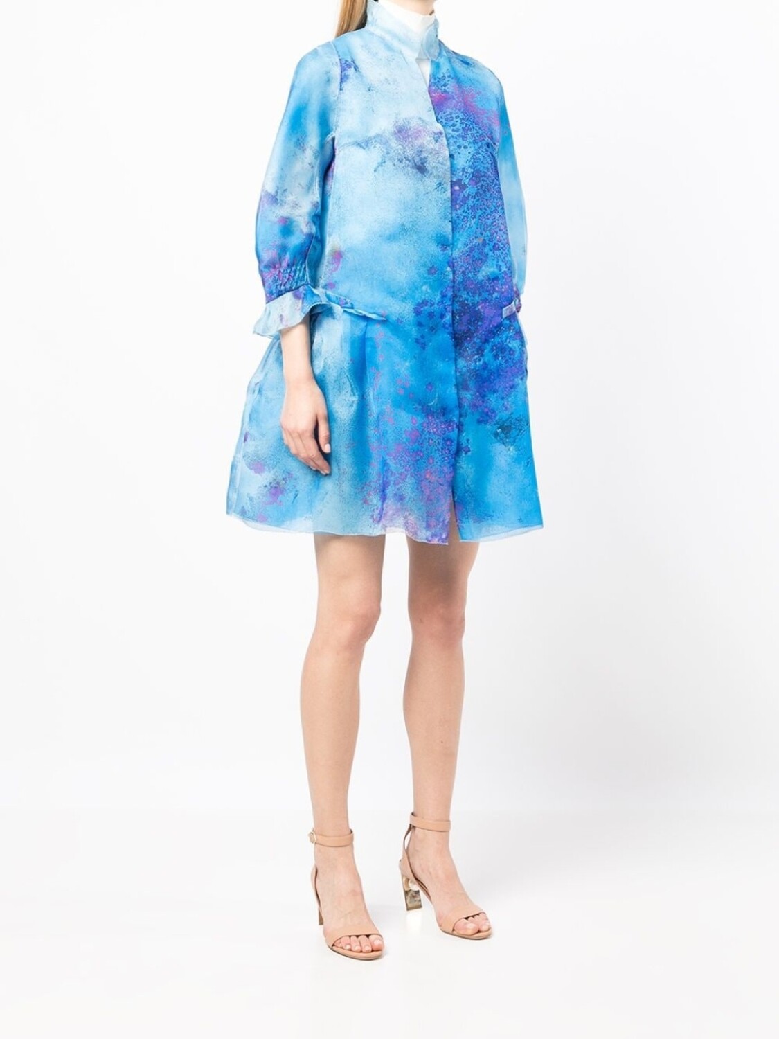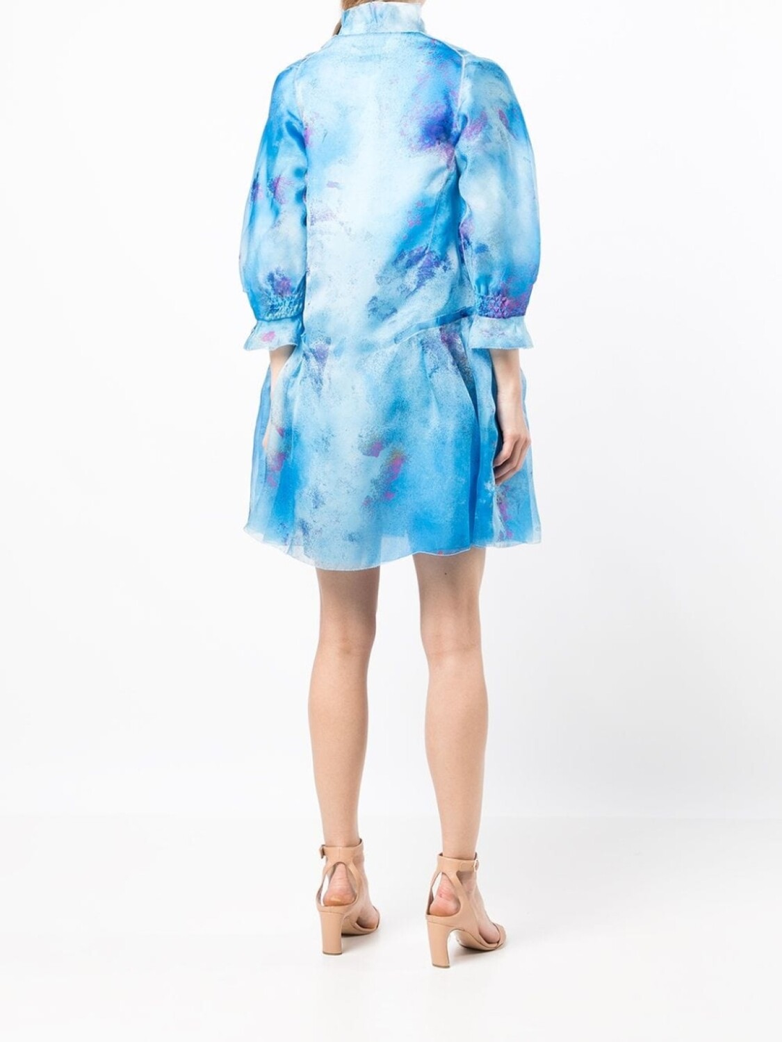 Пышные рукава три четверти, абстрактный принт, высокий воротник и дизайн со сборками. Цвет: синий.