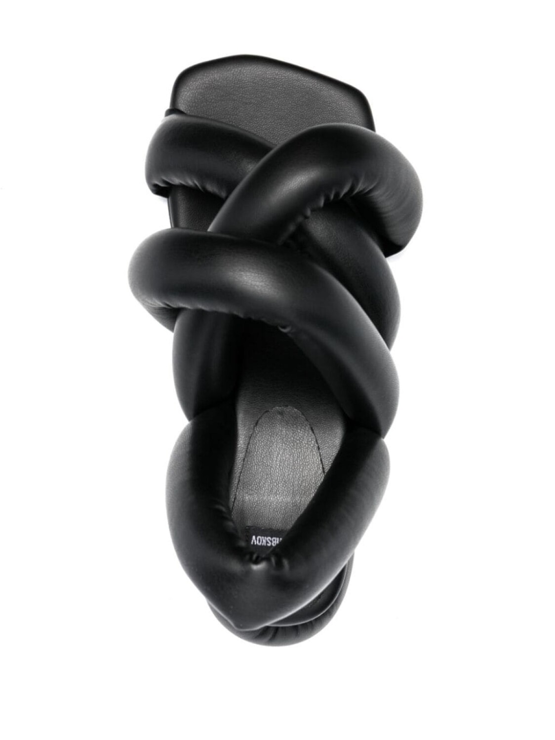 Черный, дутый материал, перекрестные ремешки, открытый носок, квадратный носок, модель без застежки, логотип на стельке и блочный каблук средней высоты.