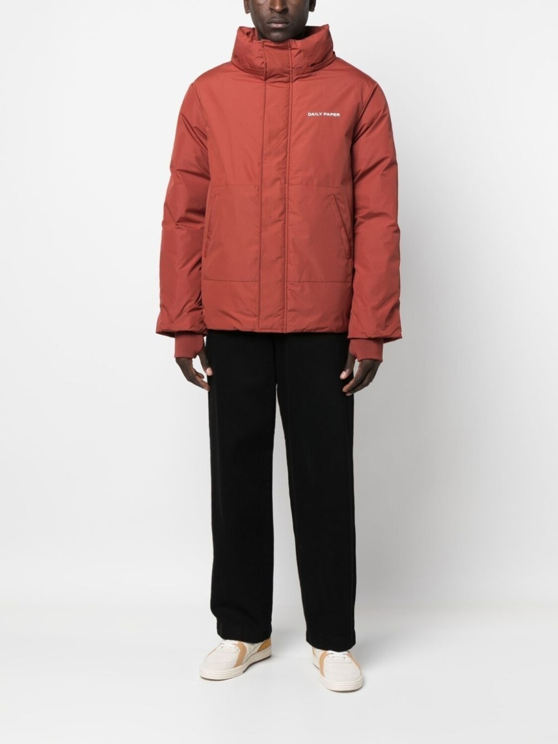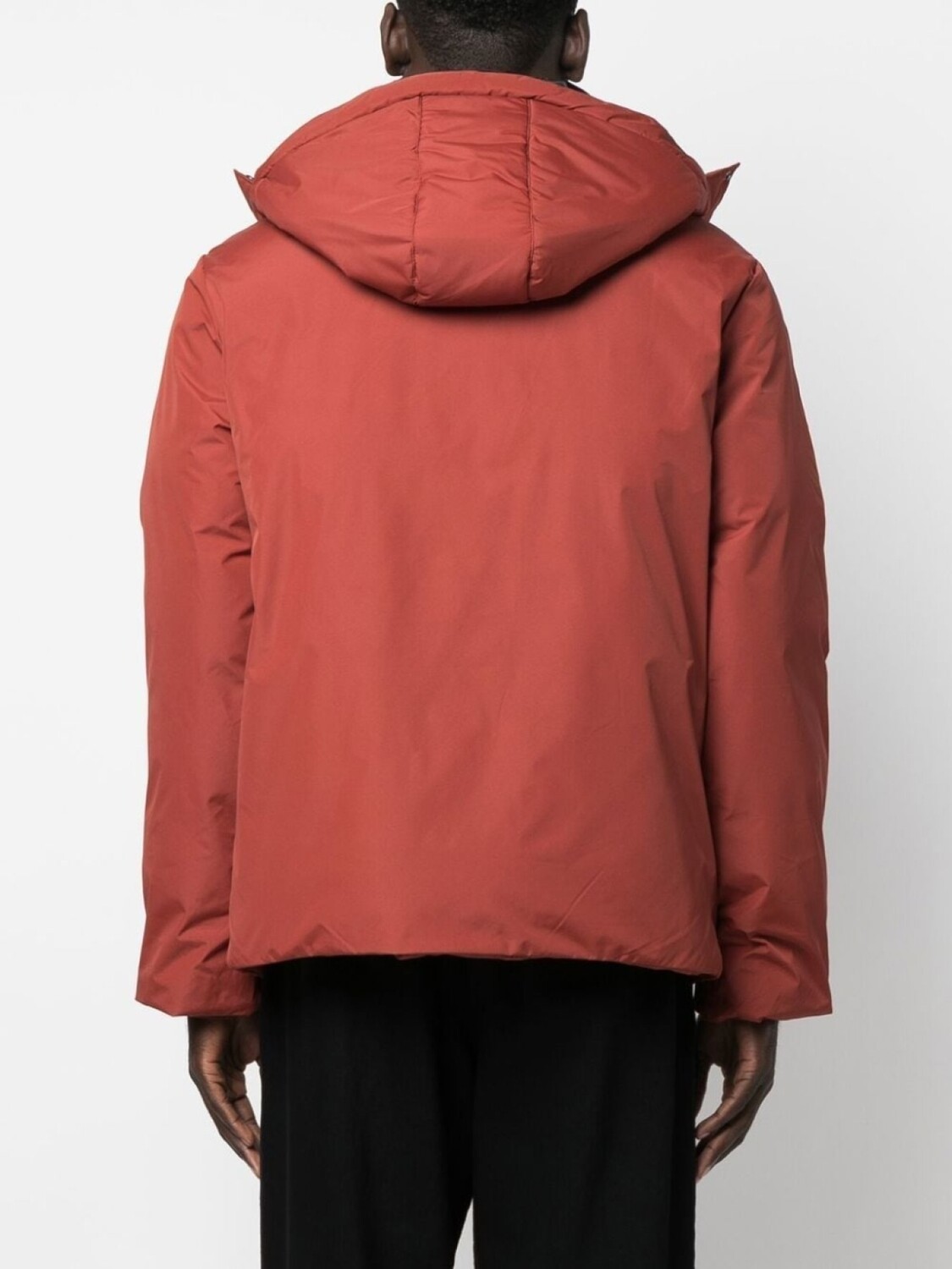 Кирпично-красный, переработанный полиэстер, тисненый логотип спереди, воротник-труба, съемный капюшон, потайная молния спереди и длинные рукава.