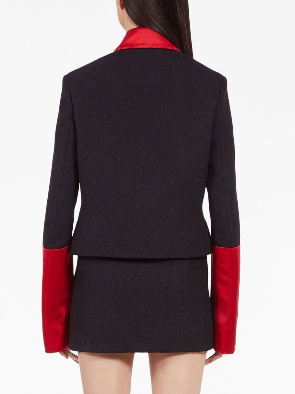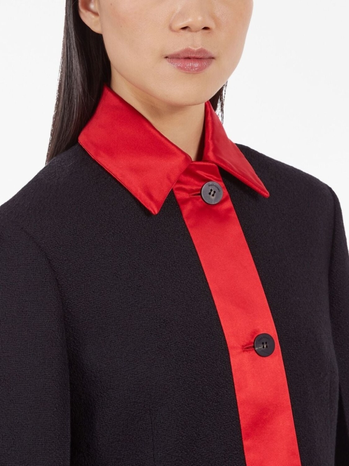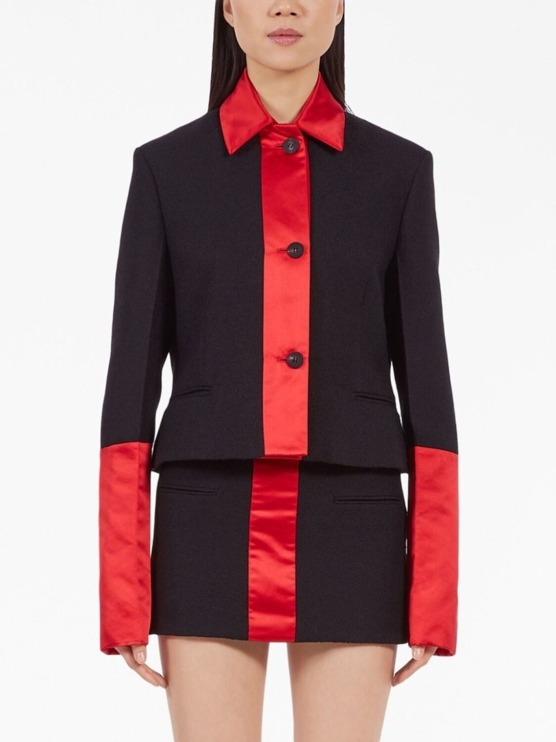 Черный/красный, шелк, сатиновая фактура, дизайн колор-блок, укороченная длина, прямой воротник, застежка на пуговицах спереди, длинные рукава и закругленный подол.