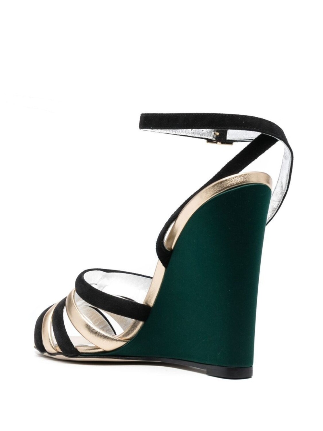 Насыщенный зеленый, золотистый, замша, покрытие с эффектом металлик, ремешок на щиколотке с пряжкой, логотип на стельке и высокая танкетка.