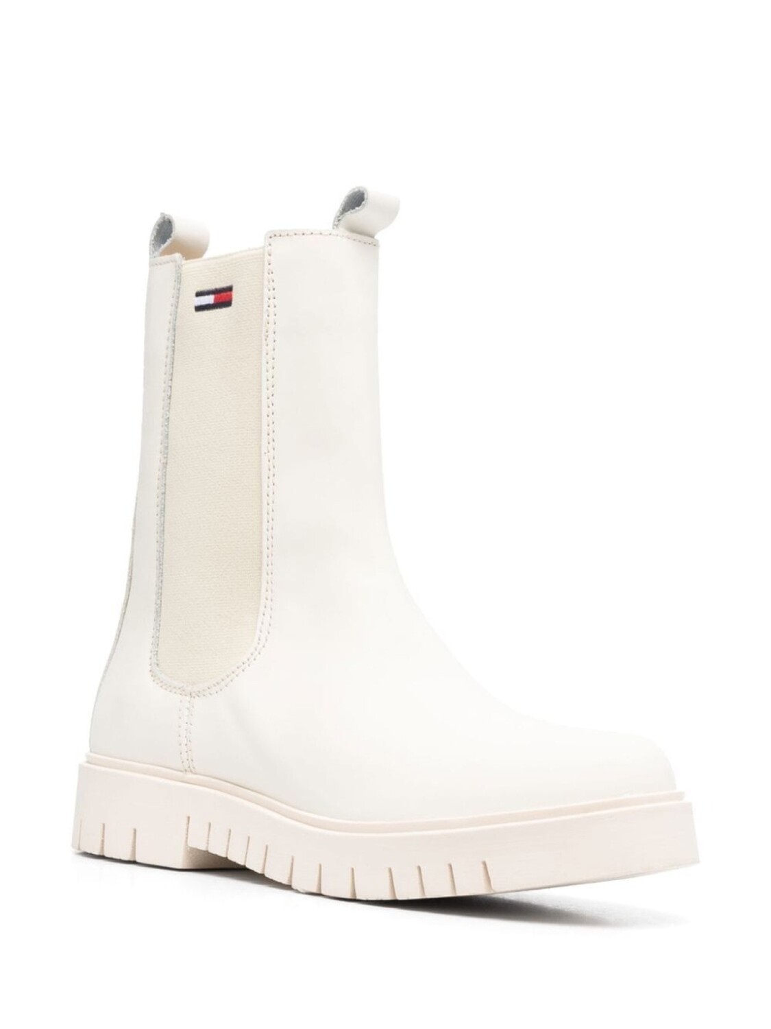 Кремово-белый, телячья кожа, вышитый логотип сбоку, эластичные боковые вставки, двойная петля для подтягивания, высота по щиколотку, закругленный носок и массивная резиновая подошва.