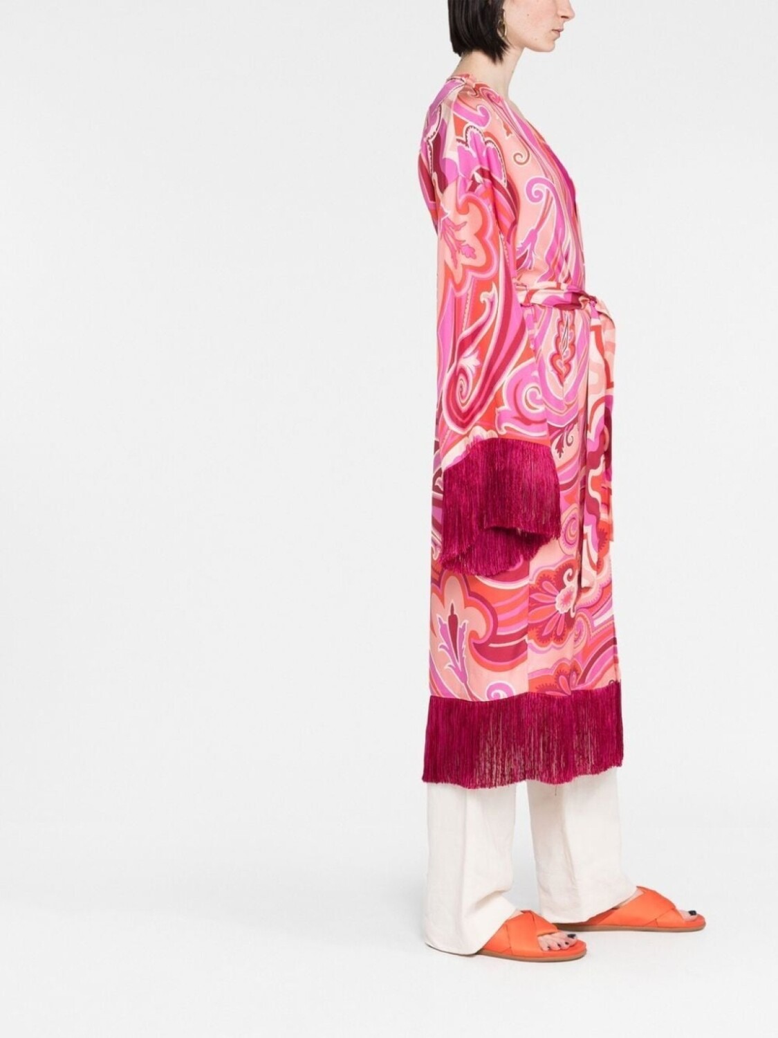Фуксия, шелк, принт пейсли, края с бахромой, длинные рукава, без застежки и длина до середины голени.