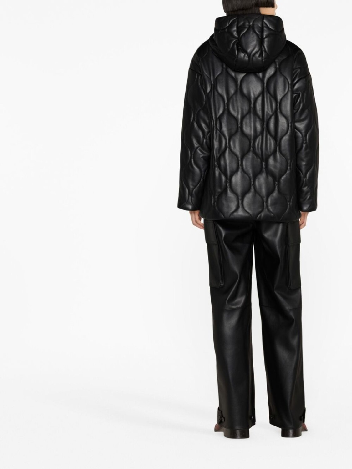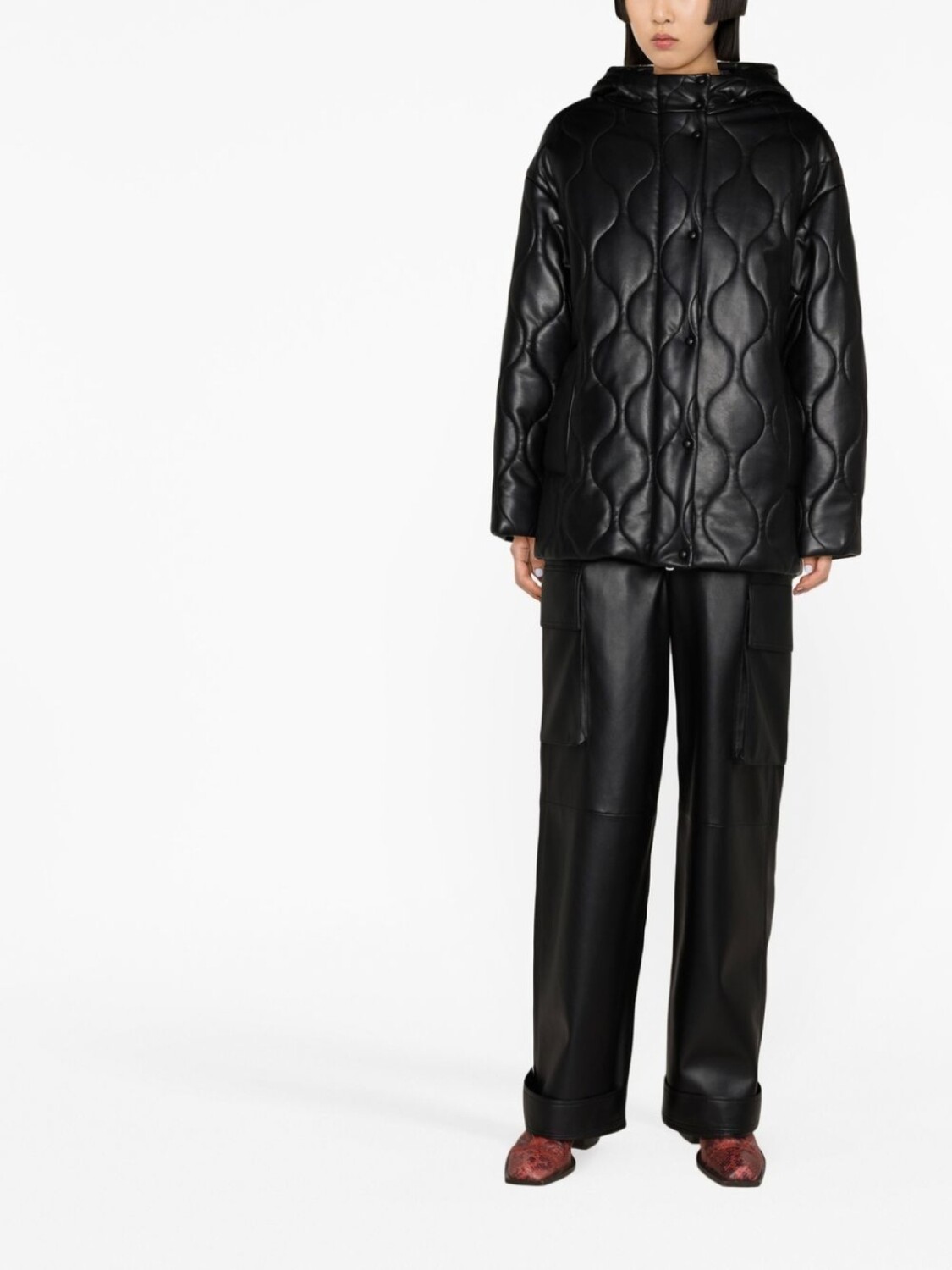 Черный, искусственная кожа, стеганая модель, классический капюшон, застежка на кнопках спереди, длинные рукава и два прорезных кармана сбоку.